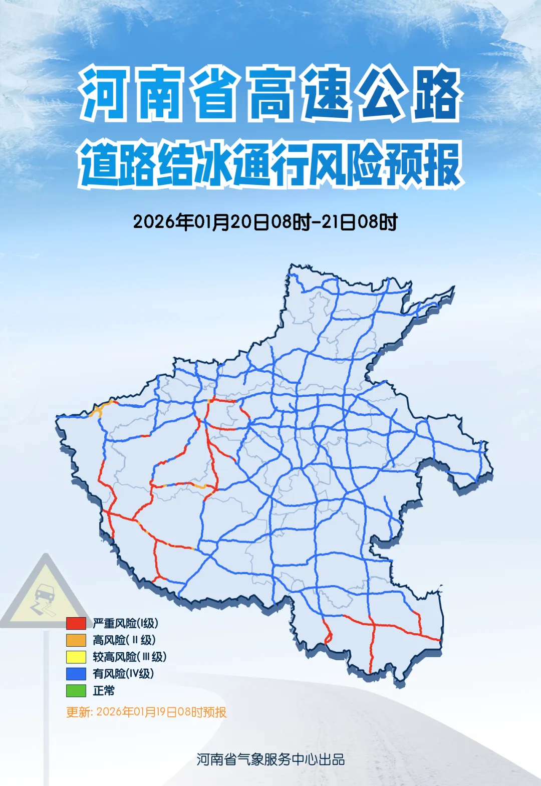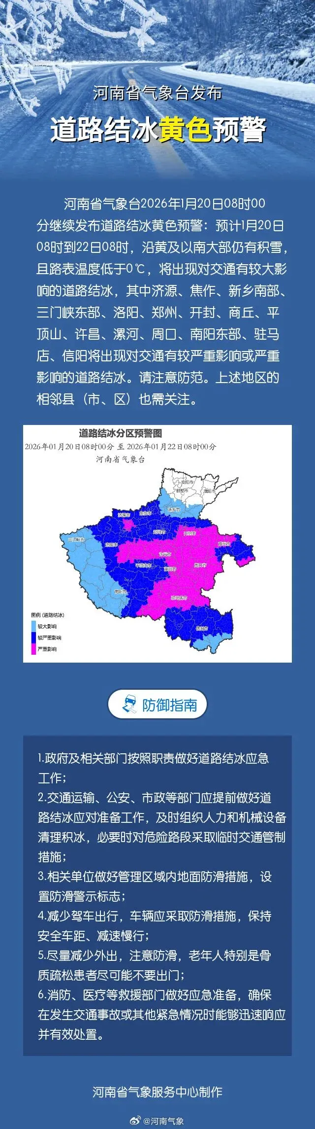 河南省气象台2026年1月20日08时继续发布道路结冰黄色预警:预计1月20日08时到22日08时,沿黄及以南大部仍有积雪,且路表温度低于0C,将出现对交通有较大影响的道路结冰,其中济源、焦作、新乡南部、三门峡东部、洛阳、郑州、开封、商丘、平顶山、许昌、漯河、周口、南阳东部、驻马店、信阳将出现对交通有较严重影响或严重影响的道路结冰。请注意防范。上述地区的相邻县(市、区)也需关注。