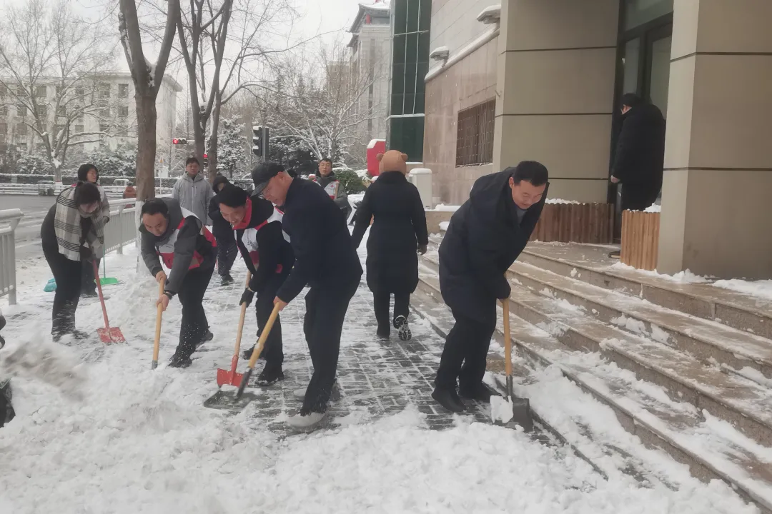“阿姨您慢点走,这边台阶已经清理干净了!”在人行道上,红十字会机关党员干部沿着路边稳步推进,细心清理每一处积雪,身后留下整洁通畅的通行区域。考虑到夜间气温极低易结冰,他们将积雪集中堆放在路旁安全区域,形成一道道白色“防护墙”,既避免二次结冰,又保障行人车辆安全。针对老年人、儿童出行集中的营业厅出入口、公交站点等重点点位,红十字志愿者们反复清扫、细致检查,确保无死角、无隐患。一场扫雪行动,不仅扫通了出行路,更拉近了党员群众的心,让寒冷的冬日充满了融融暖意。