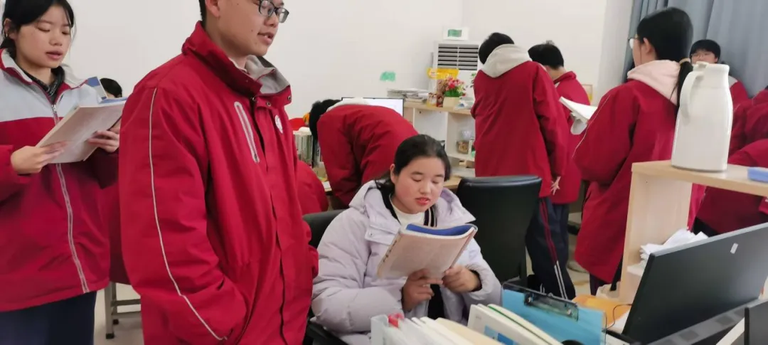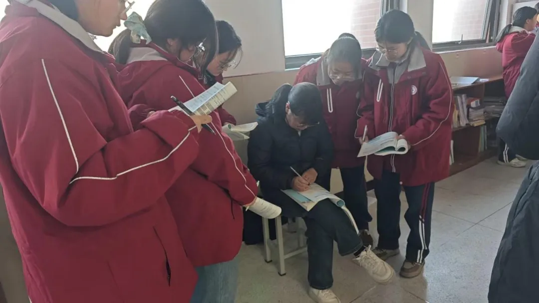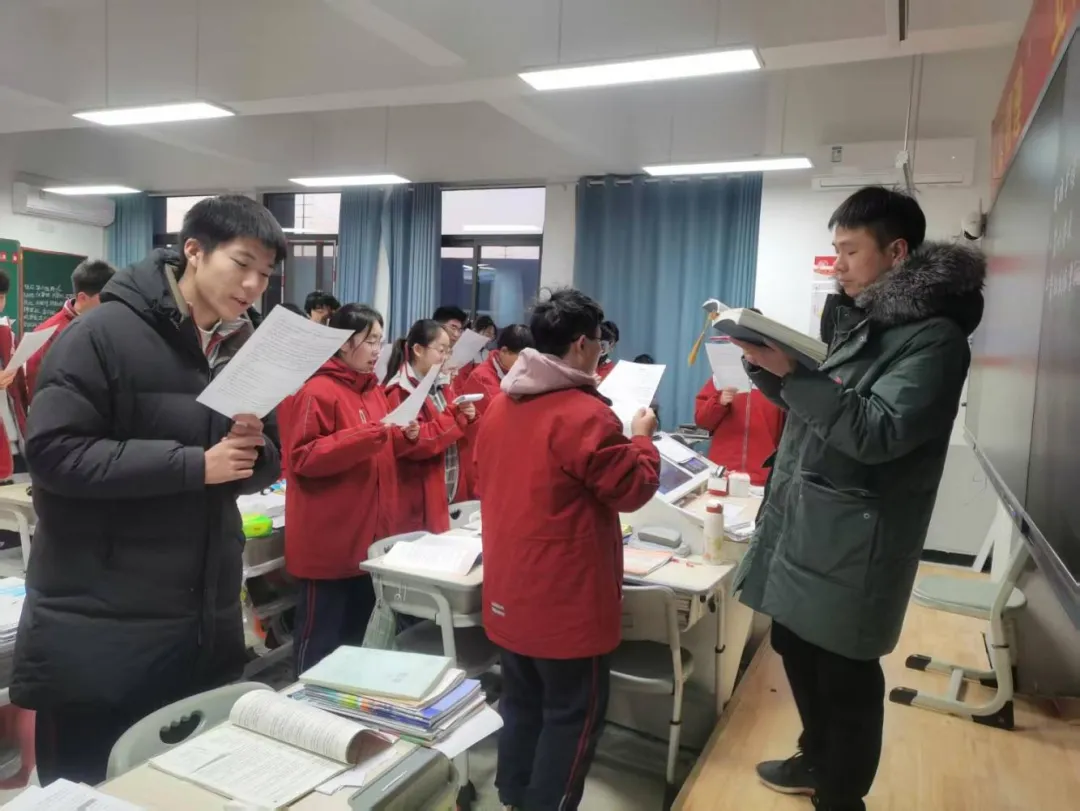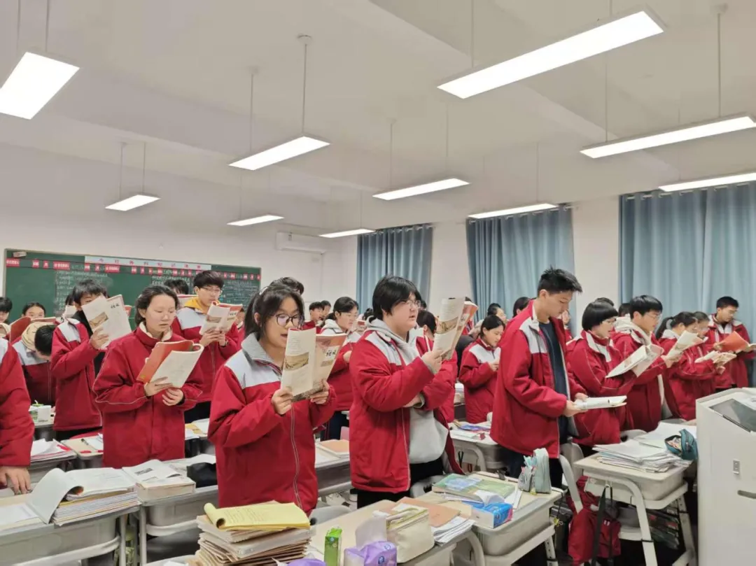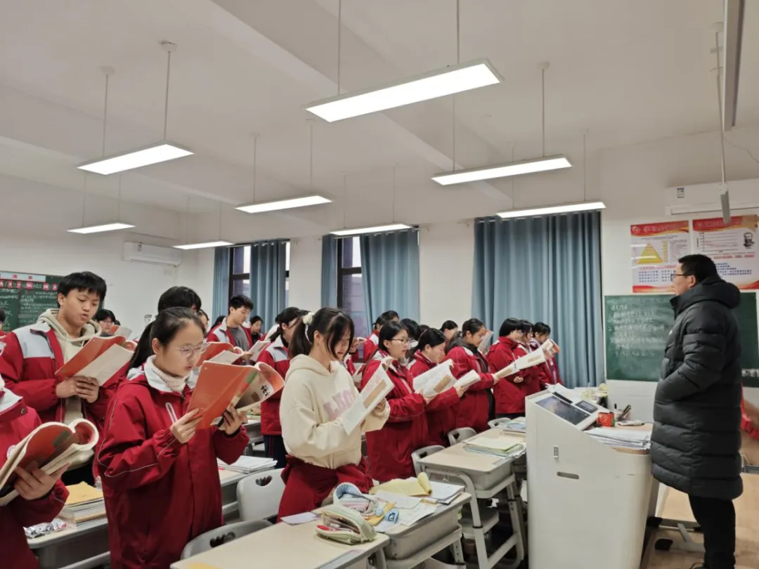 教室外朔风裹着碎雪,玻璃窗上凝着薄薄的霜花。朗朗书声与寒风的呼啸声交织,晨光与灯光交相辉应,朝气挺拔的身姿,高亢嘹亮的声音,专心专注的深情,一起晕染成冬日清晨最动人的风景……