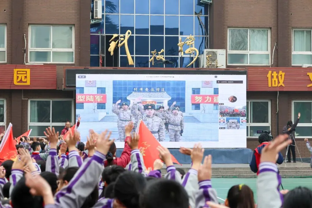 上午9:30,活动正式拉开序幕。安阳市三官庙小学的队员们身着整齐校服、佩戴鲜艳红领巾,以昂扬的精神面貌列队肃立。与此同时,官兵代表们也在营地升旗区集结完毕,军容严整、身姿挺拔,目光中满是坚毅。两地通过直播镜头相互致意,屏幕内外洋溢着跨越山海的温暖情谊。