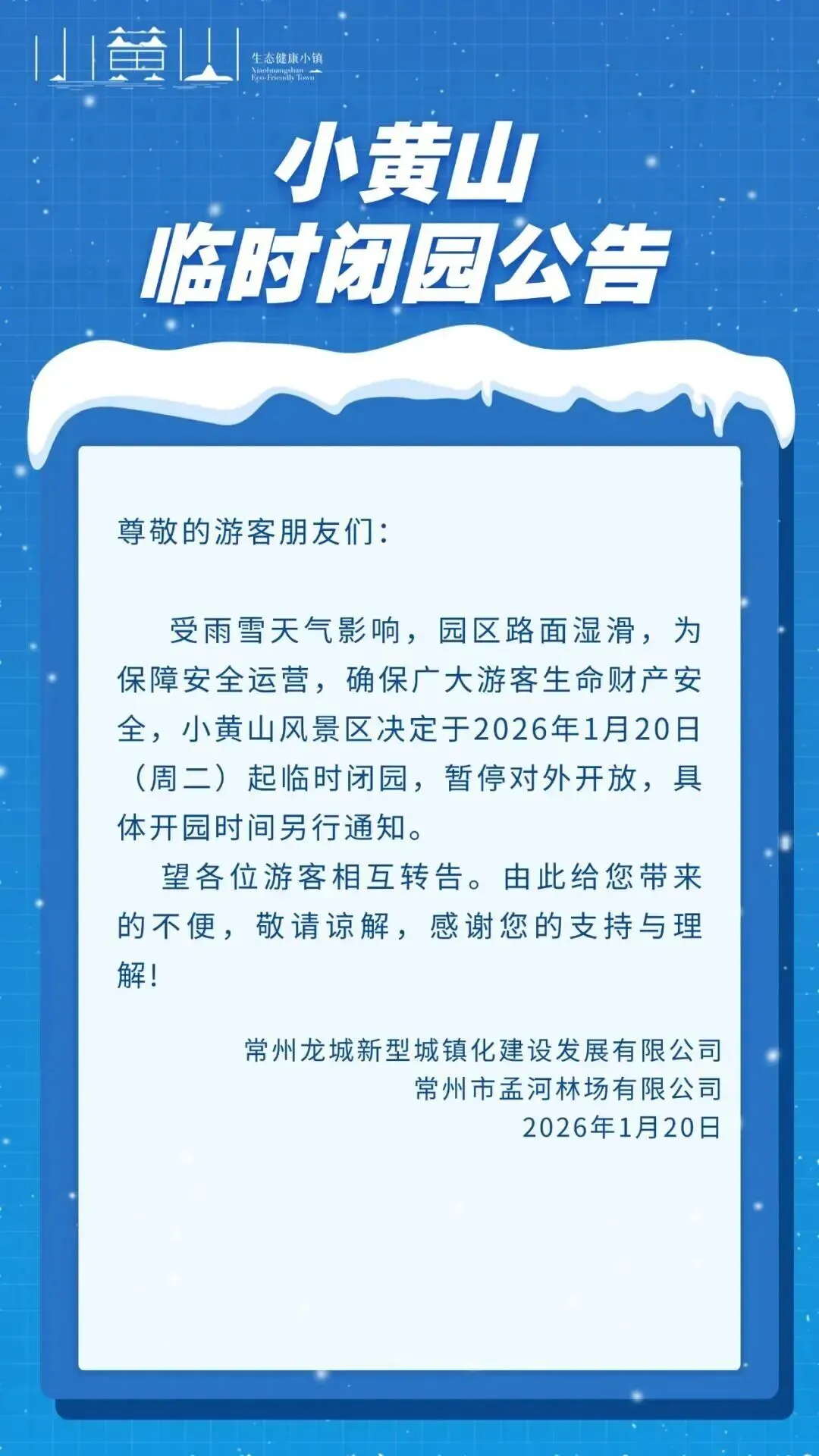 因受寒潮天气影响,为保障广大游客朋友们的安全,茅山金牛洞景区将于2026年1月20日起闭园,恢复开放时间将根据天气转好情况另行通知。已在线上平台购票的游客朋友,可联系原购票平台办理改签或退票。如有疑问,可咨询景区服务热线:0519-82481035。望广大游客朋友们相互转告与理解。给您带来不便,我们深表歉意!
