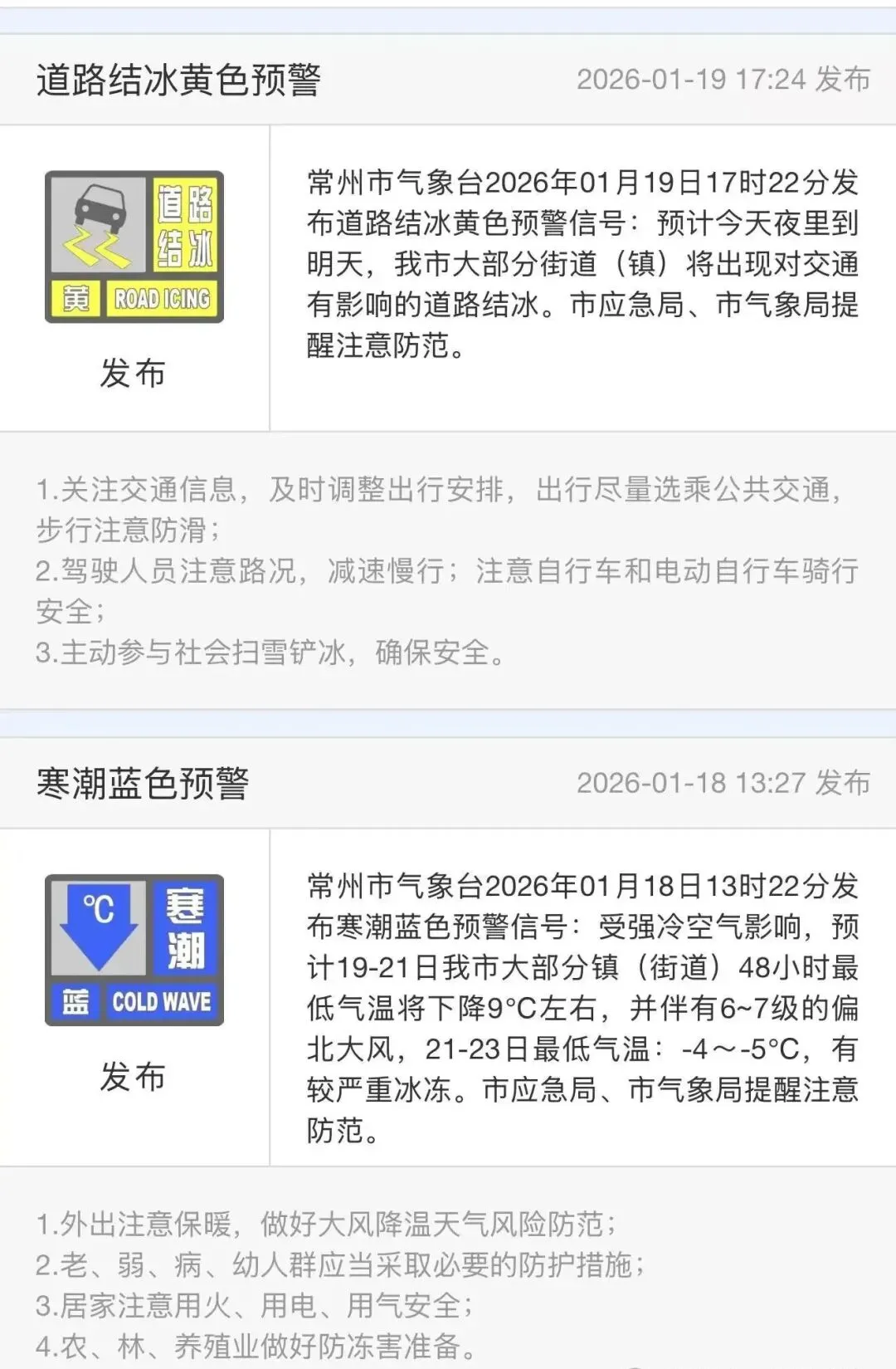 常州道路结冰黄色预警