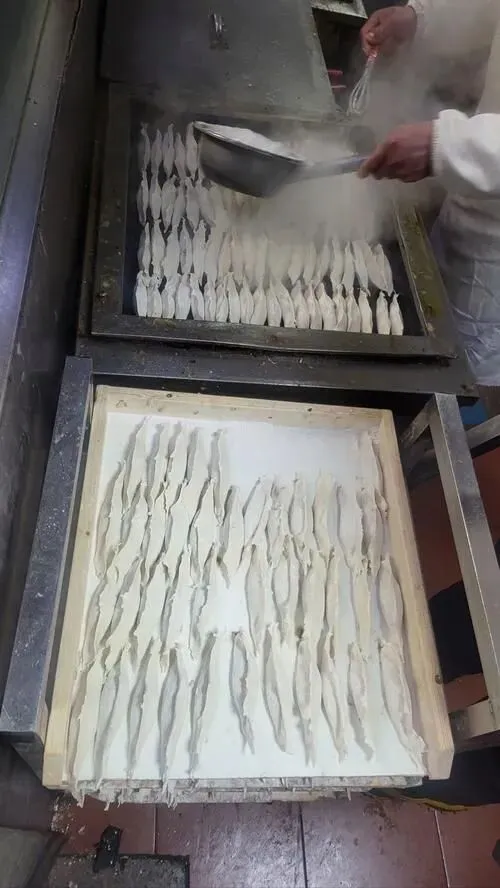 洛阳锅贴是长条形的,底部煎得焦脆,一排排码在平底锅里,金黄油亮。