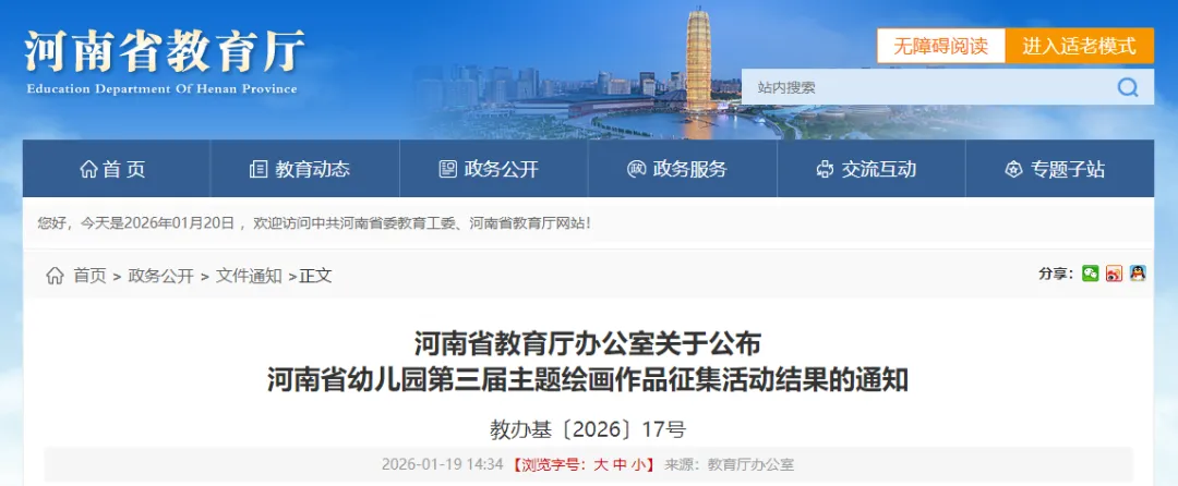 根据《河南省教育厅办公室关于征集河南省幼儿园第三届主题绘画作品活动的通知》要求,经各地推荐、专家评审、结果公示,现将活动结果予以公布(见附件)。