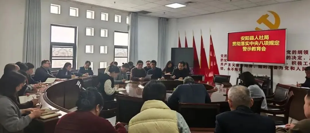 根据安阳县纪委派驻纪检监察组的要求,县人社局于1月19日在局小会议室,组织召开关于贯彻落实中央八项规定精神警示教育专题会议。局全体领导班子成员、各股室负责人准时参会。