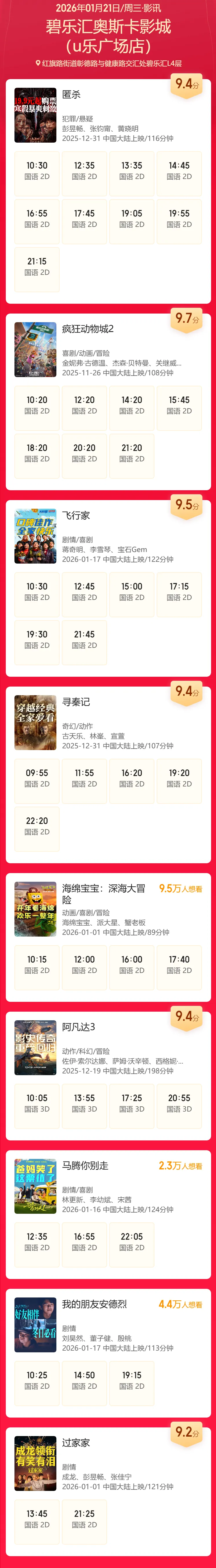 安阳碧乐汇奥斯卡影城1月21日影讯(影讯仅供参考,具体排片以影院当日播出为准)