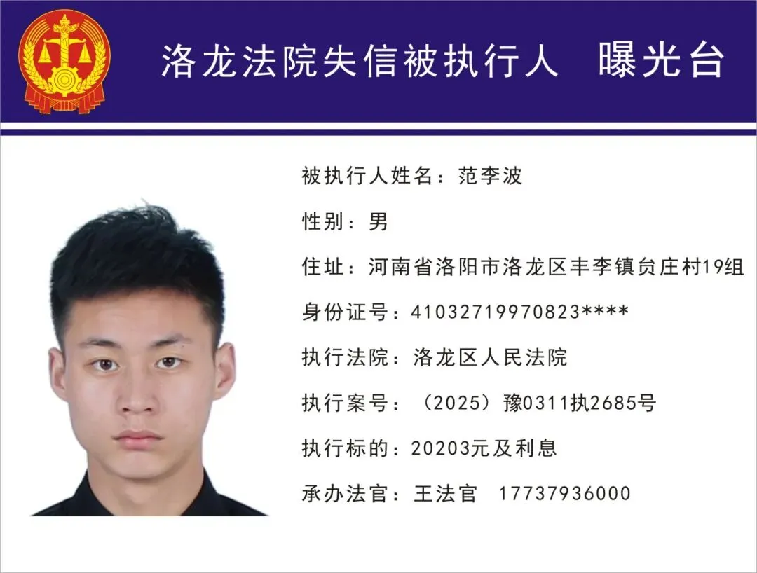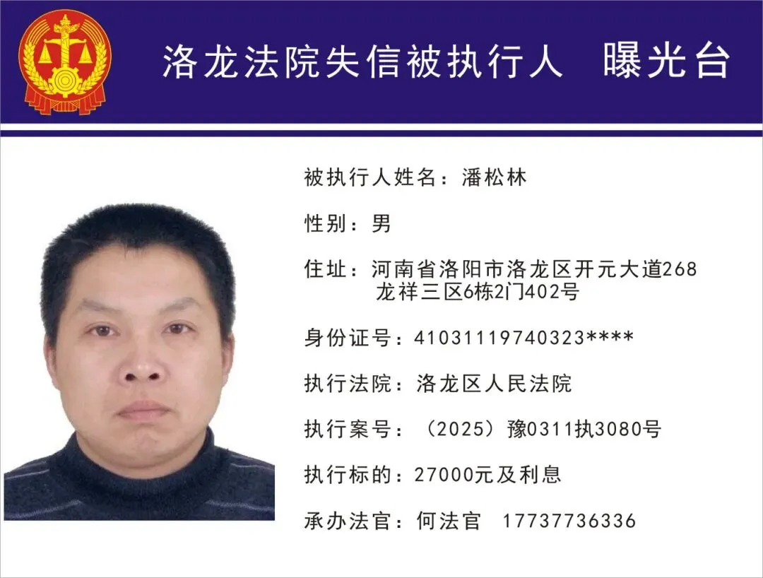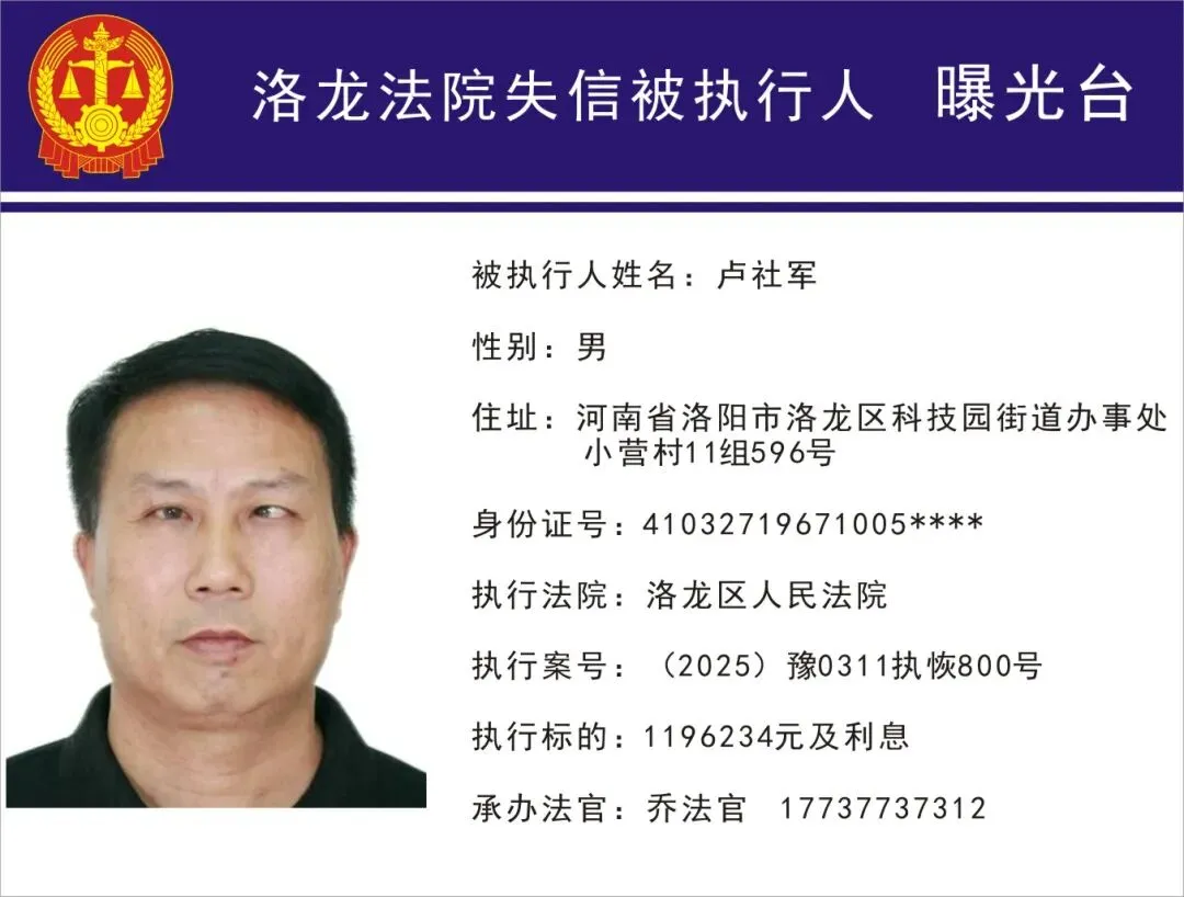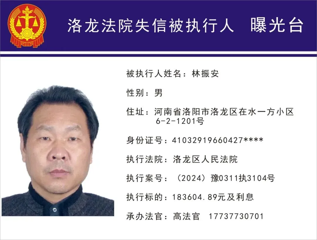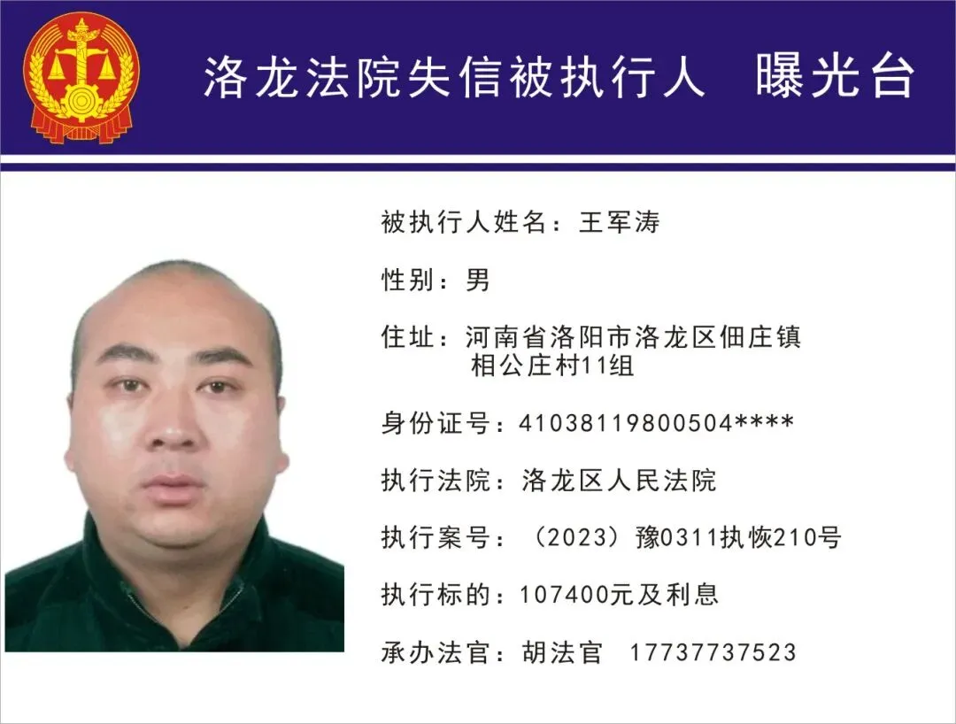 洛龙法院正告尚未履行完法律文书确定义务的被执行人,一处失信,处处受限!与其惶惶不可终日,不如积极诚信履行,切莫抱有侥幸心理,更不要以身试法,如果仍执迷不悟、抗拒执行,法院将依法强制执行,穷追猛打,严惩不贷!欢迎广大群众积极举报被执行人财产线索!