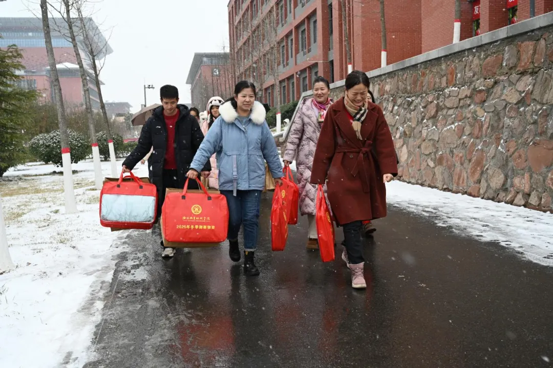 1月19日,时临大寒时节,大雪纷飞,气温骤降。洛阳职业技术学院副校长、关工委副主任任扬、关工委执行主任邓卫国带领学生中心负责同志和相关工作人员冒雪走进有关二级学院宿舍,为家庭经济困难学生送去羽绒服和冬季保暖物资。