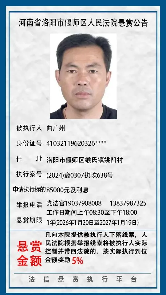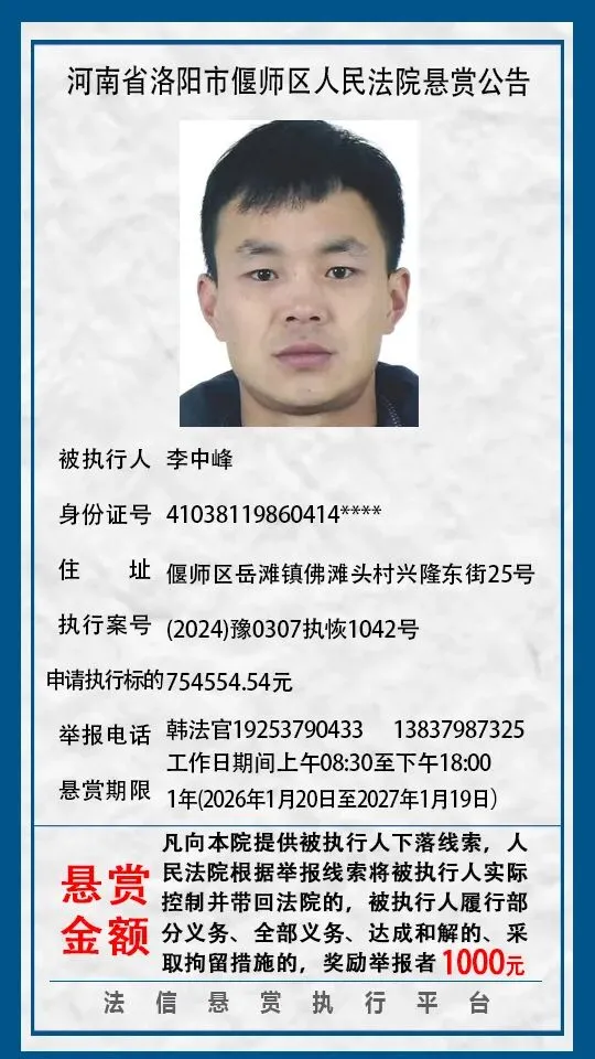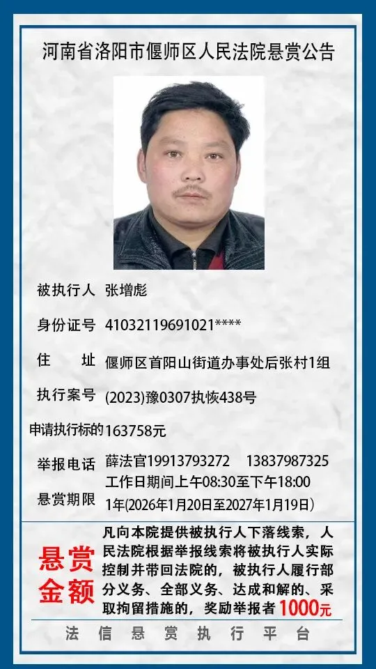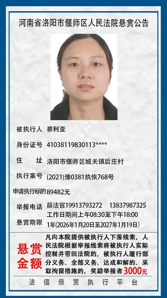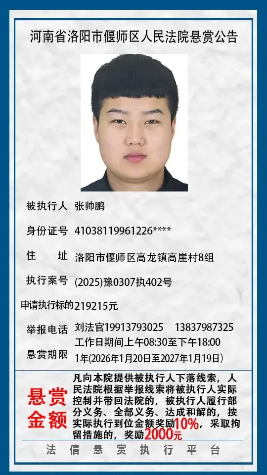 河南省洛阳市偃师区人民法院悬赏公告(2026年1月第一期)