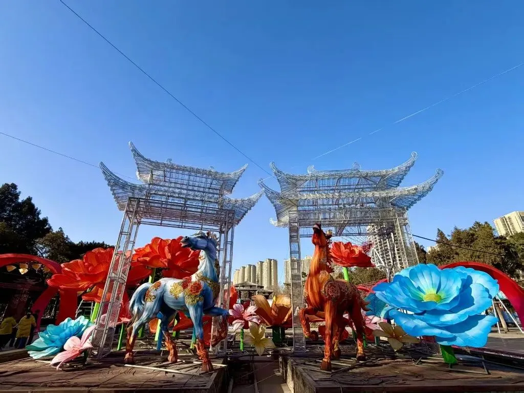当前,位于王城公园的“马到成功”灯组筋骨已立,待试灯时将一改“素颜”面容、幻化为银丝古建,成为本届灯会的预期亮点之一。