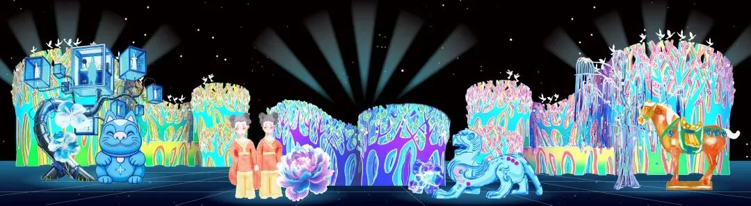 今年,洛阳博物馆的“顶流”文物——“彩绘陶牵手女俑”也将以灯组形式亮相,构成隋唐城遗址植物园“古韵智光”灯组的一部分。该灯组长达45米、宽12米,以动态卷轴形式缓缓铺展,一同呈现的还将有石辟邪、三彩黑釉马、瑞兽天禄等富含吉祥寓意与历史底蕴的IP形象造型,精准对接年轻游客的审美。