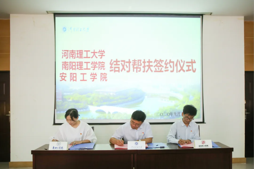 郑小九、南阳理工学院马克思主义学院党委书记彭民工、安阳工学院马克思主义学院院长杨利英分别代表三校在结对帮扶协议上签字。