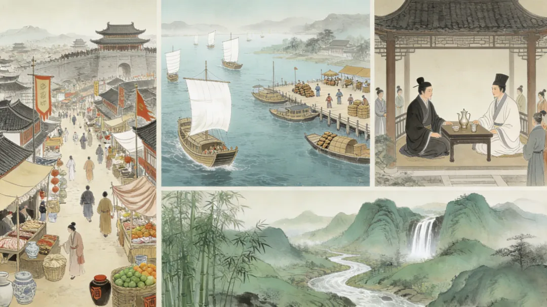 与《蜀都赋》“四方疆域—城邑中心”的陆地空间逻辑不同,《吴都赋》以“江海”为核心构建空间体系,形成“水域—城邑—荒野—远海”的层层拓展格局。开篇以“三江既入,震泽底定”定调水域根基,继而铺陈江河奔涌、大海浩瀚的壮阔景象,再聚焦吴都城邑的繁华、荒野的物产,最后延伸至远海航行与海外朝贡,从内陆到海洋,从近处到远方,构建立体化的东吴地域图景,展现出与《蜀都赋》陆地视野截然不同的江海气象。