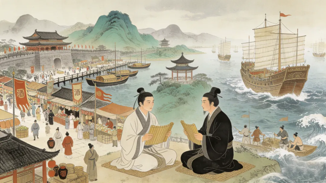 《吴都赋》以《蜀都赋》的对话体为延续,通过“西蜀公子”与“东吴王孙”的论辩深化主旨,形成“蜀吴对举”的叙事结构。二者均以“地域描摹—价值阐释”为行文脉络,《蜀都赋》铺陈山川险阻与城邑富饶,《吴都赋》则聚焦江海气象与市井繁华,一陆一海,一险一阔,形成鲜明互补。精神内核上,两篇均延续左思“寒门述志”的诉求,《蜀都赋》以蜀地“藏珍纳秀”喻寒门才俊,《吴都赋》则以吴地“兼容并蓄”暗喻寒门士子渴望突破地域与阶层限制,二者情感一脉相承,共同服务于《三都赋》的整体立意。