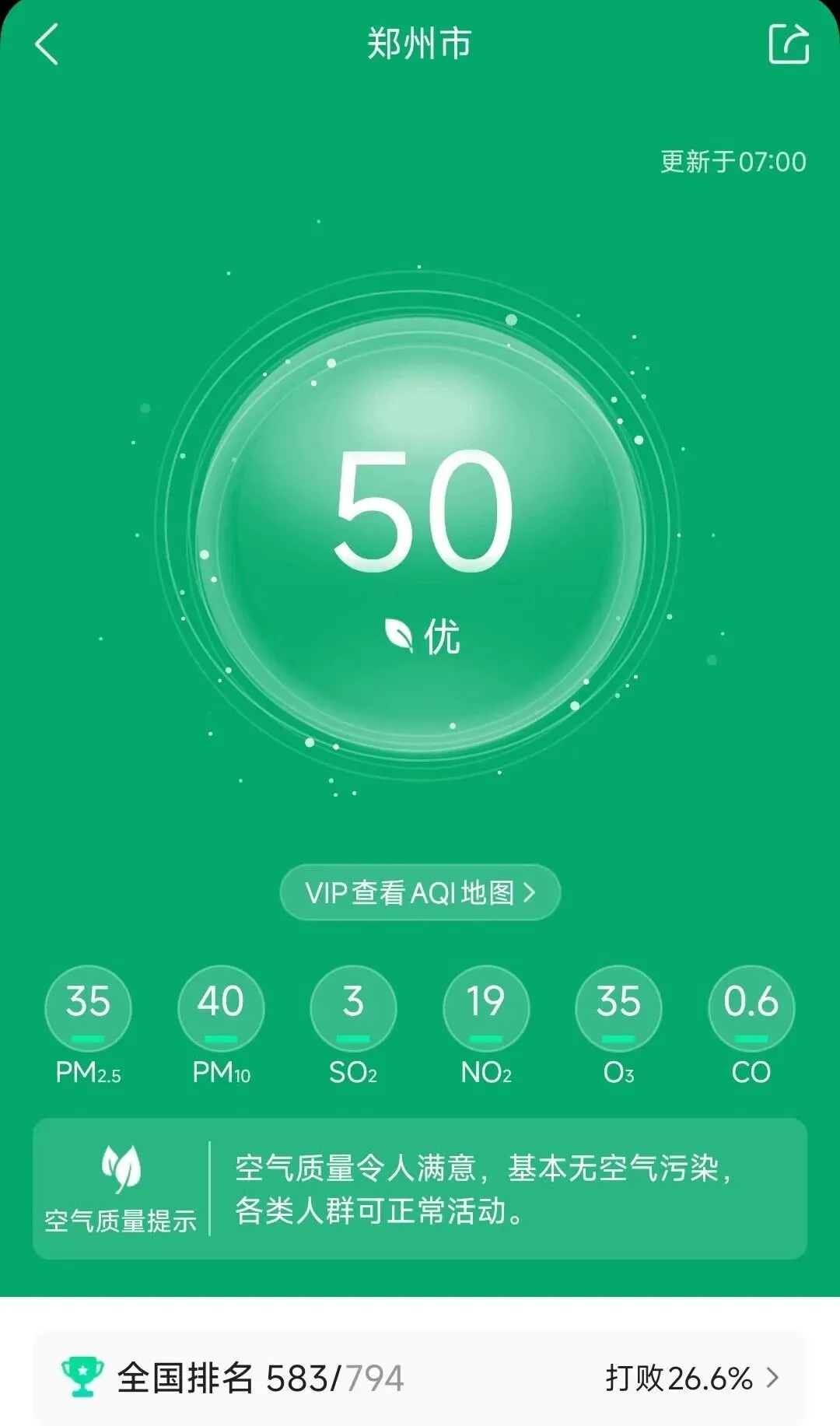 昨天早上7:00,郑州大气质量是“优”,全国排名583/794,空气质量提示:空气质量令人满意,基本无空气污染,各类人群可正常活动。