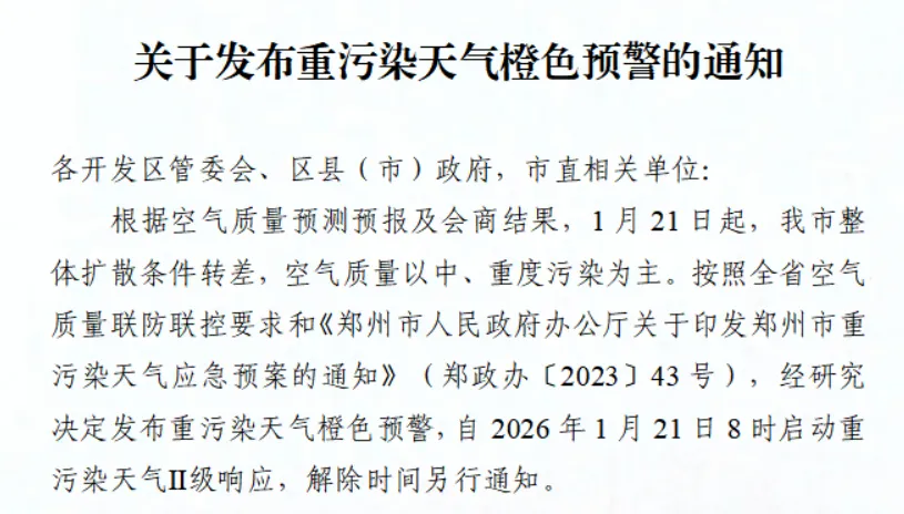 《关于发布重污染天气橙色预警的通知》提到:根据空气质量预测预报及会商结果,1月21日起,我市整体扩散条件转差,空气质量以中、重度污染为主。按照全省空气质量联防联控要求和<<郑州市人民政府办公厅关于印发郑州市重污染天气应急预案的通知>>(郑政办[2023]43号),经研究决定发布重污染天气橙色预警,自2026年1月21日8时启动重污染天气Ⅱ级响应,解除时间另行通知。