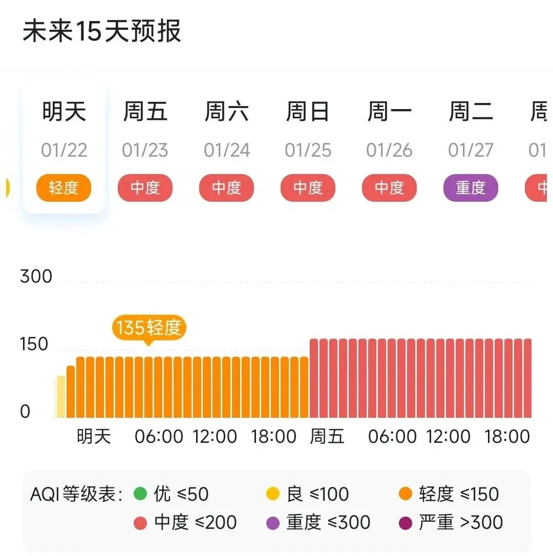 天气预报软件明确显示:明天(周四)至下周一就都是中度污染、27号(下周二)就是爆表的重度污染。