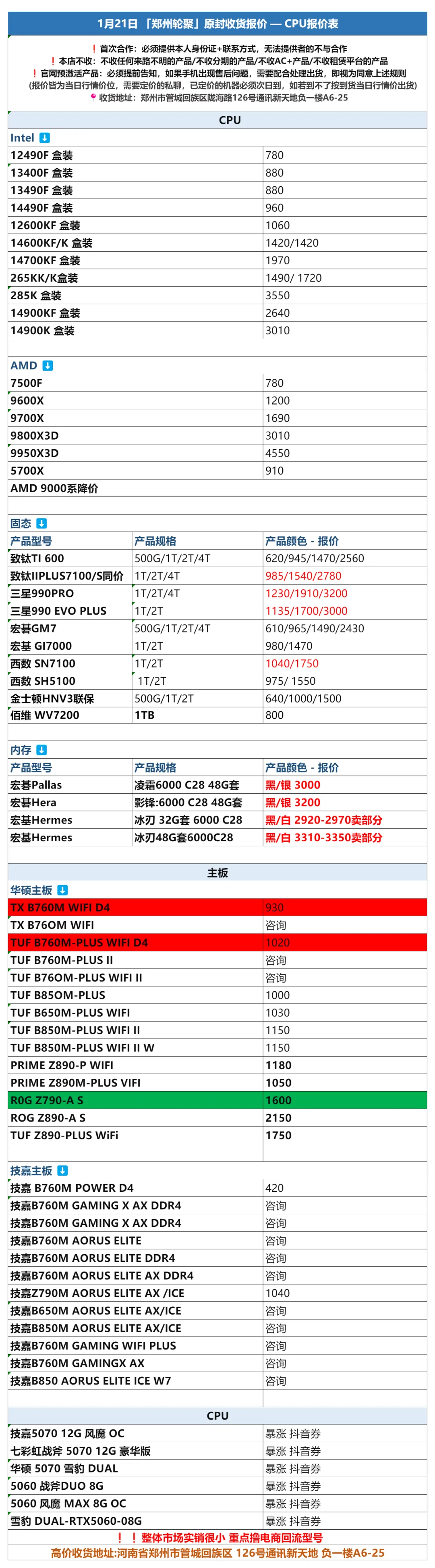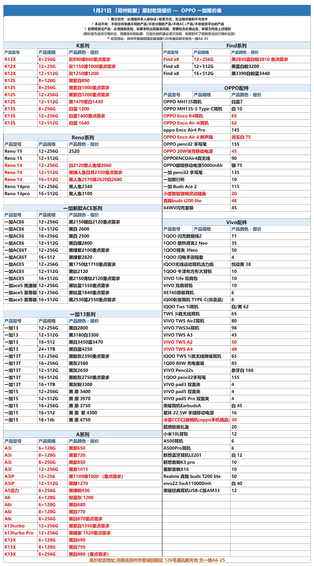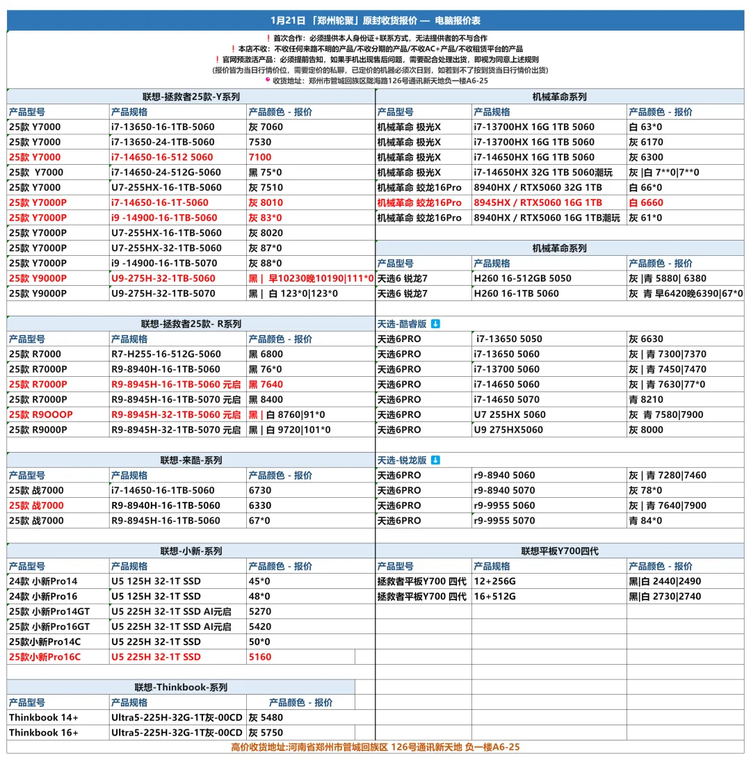 郑州轮聚通讯 2026年1.21日数码报价更新