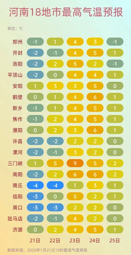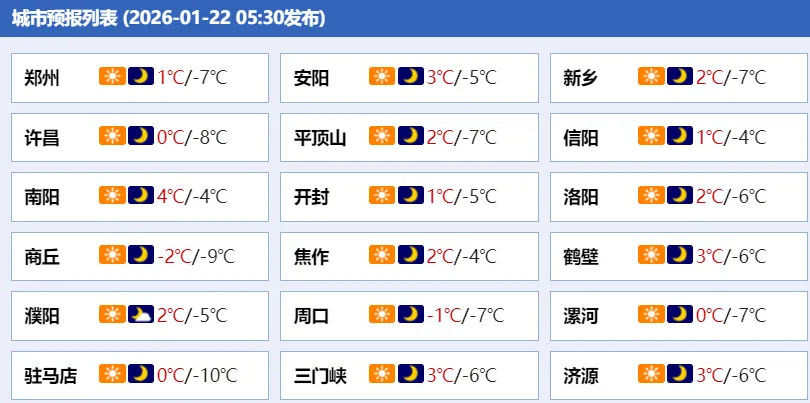 ⭐河南省气象台1月21日继续发布低温蓝色预警。预计今起三天,河南大部最低气温都在零下5度以下,其中北部、西部、东部、东南部部分县市将达零下12度到零下10度。详情>>