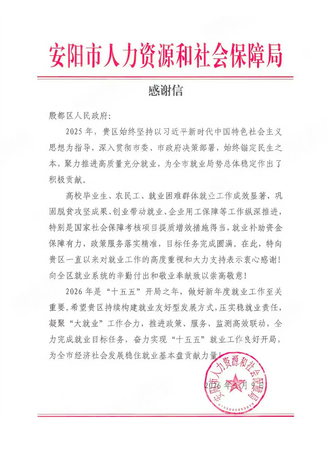 这封表扬信既是对我区人社工作的高度认可,更是对未来前行的有力鞭策。2026年作为“十五五”规划开局之年,殷都区人社局将进一步压实稳就业责任,聚焦投资于人、强化技能赋能、优化服务供给,推动人社各项工作再上新台阶,奋力实现 “十五五” 人社事业良好开局,为民生福祉提升与经济社会高质量发展注入更强动力。