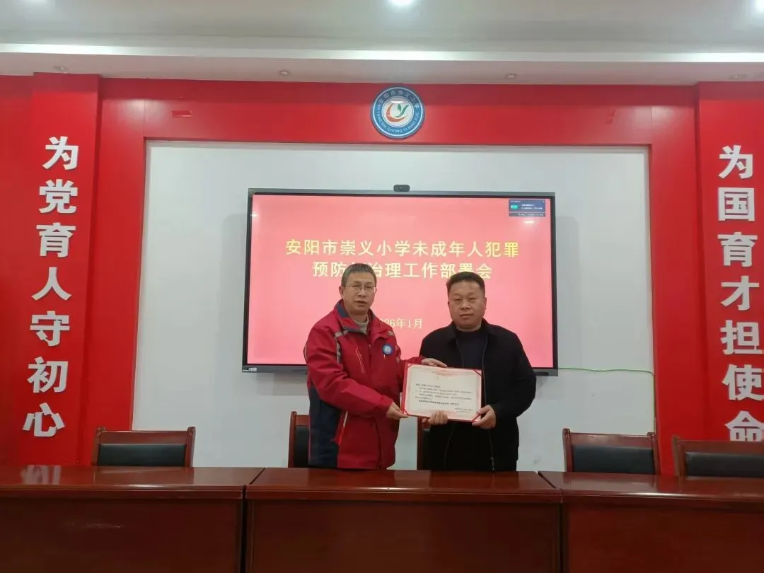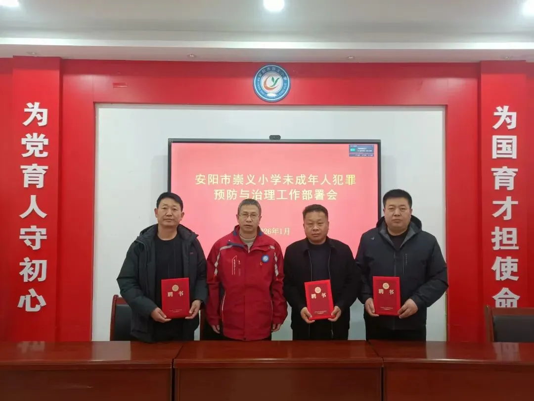 为深入贯彻落实上级关于未成年人犯罪专项治理工作的决策部署,有效预防未成年人犯罪,坚决杜绝校园欺凌现象,营造安全、健康、和谐的校园环境,安阳市崇义小学于2026年1月20日下午,在学校会议室隆重召开了未成年人犯罪预防与治理工作部署会。
