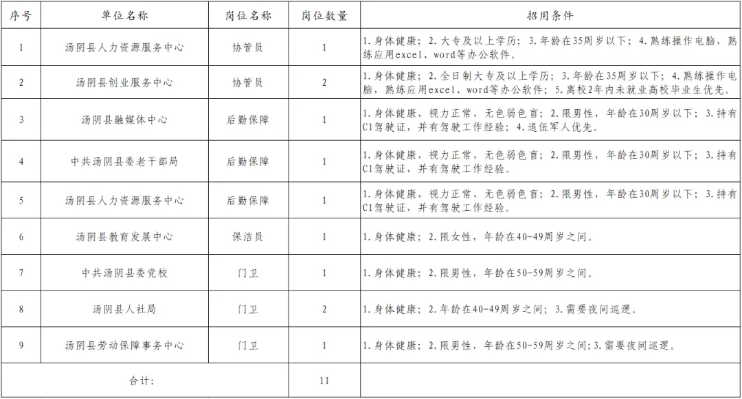 2、我们转推此文,旨在为广大求职者提供信息来源,如需删除,请联系小编。3、请各位求职者提高警惕,凡涉及收取各种费用或几乎不面试就给出录取通知,且到外地就职的招聘等,务必仔细辨别,谨防上当受骗!根据《河南省人力资源和社会保障厅 河南省财政厅关于印发<河南省公益性岗位管理办法>的通知》(豫人社办〔2020〕23号)文件精神,为更好地为就业困难群体开展有效就业援助,促进就业困难人员再就业,现向社会公开招聘11名公益性岗位人员。现将招聘有关事项公告如下: