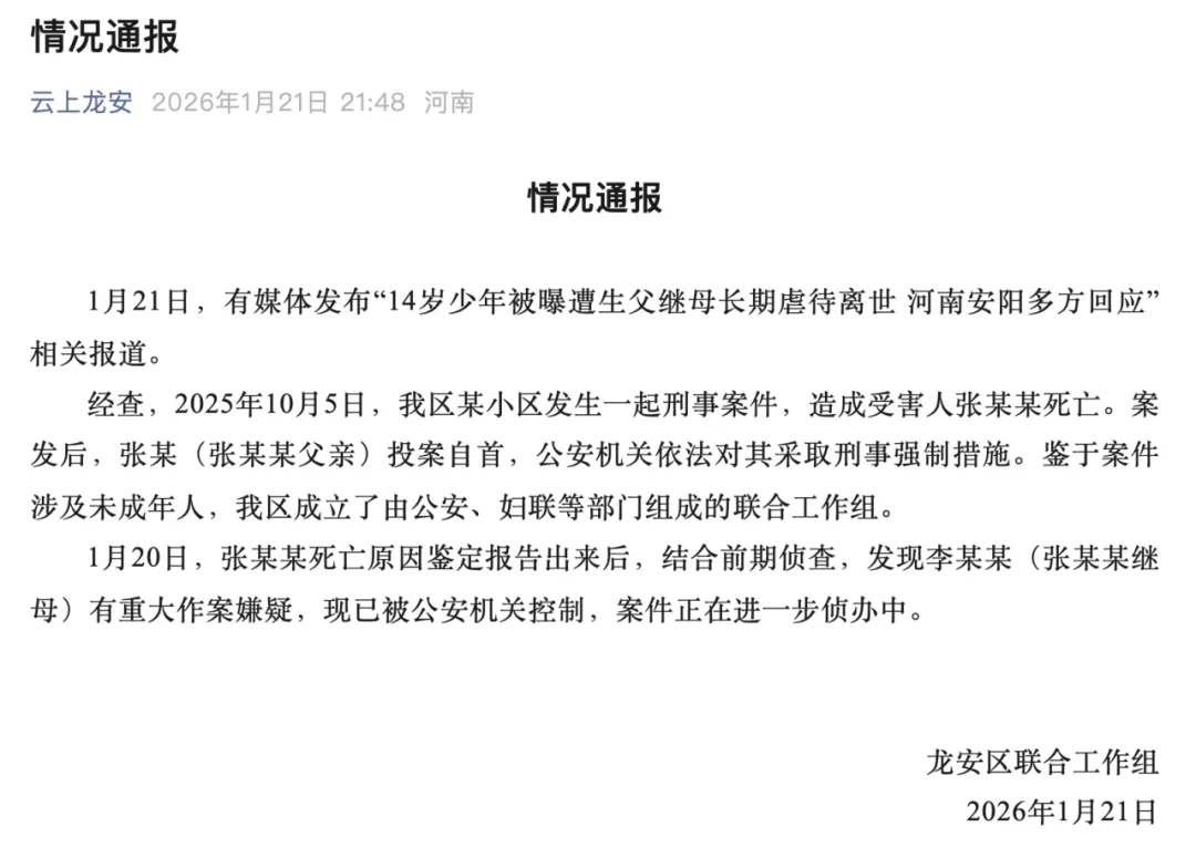 1月21日,有媒体发布“14岁少年被曝遭生父继母长期虐待离世 河南安阳多方回应”相关报道。