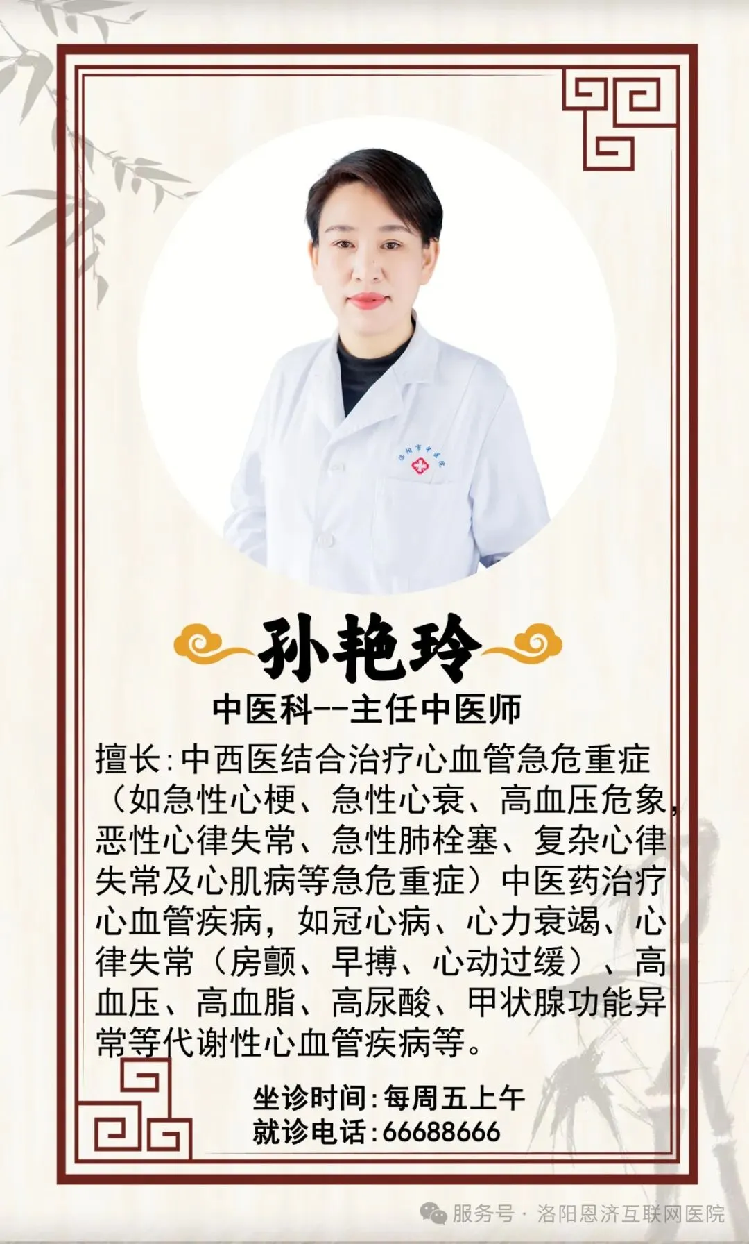 孙艳玲,主任中医师,洛阳市中医院心内科主任、洛阳市特级名医、河洛医疗卫生领军人才、中华中医药学会心血管分会委员、河南省康复学会心血管分会副主任委员、洛阳市中医学会心病专业委员会主任委员、洛阳市医学会心血管专业委员会副主任委员。从事临床工作30年,技术精湛,经验丰富。