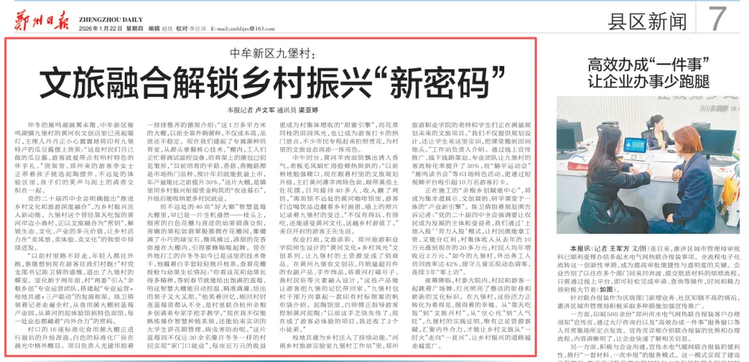 1月22日,《郑州日报》发表题为:《文旅融合解锁乡村振兴“新密码”》新闻,报道我校携手中牟新区九堡村共建乡村旅游实验室,校地共建赋能乡村振兴,以下为报道全文: