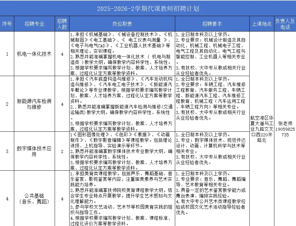 4.薪资待遇:代课教师薪资按学校相关规定执行,根据个人职称、职业资格等级、教学年限、企业工作经历、教学效果等因素进行阶梯式上浮,具体标准面议。