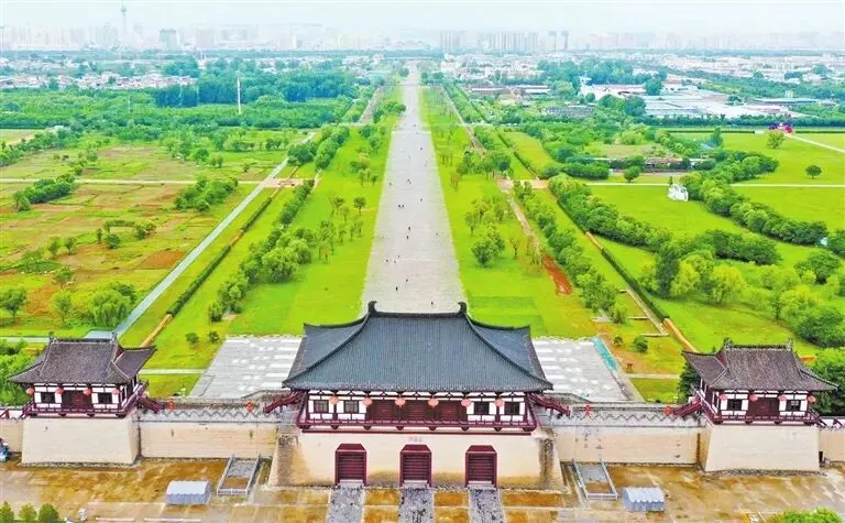察其气象:汉家宫阙接云平,唐苑牡丹映日明。则天明堂擎玉斗,玄宗霓裳舞太清。胡商醉枕天津月,遣唐帆悬沧海旌。四方文字刻碑碣,九域风烟汇帝城。此间气象吞八荒,文明火炬永传薪。