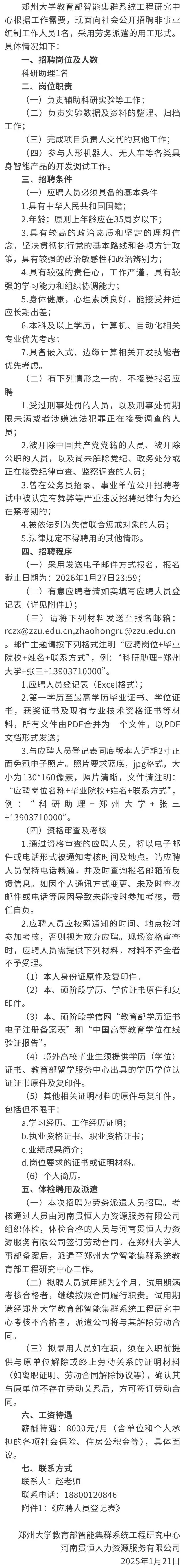 >郑州大学教育部智能集群系统工程研究中心面向社会公开招聘非事业编制(劳务派遣)工作人员【至1月27日】