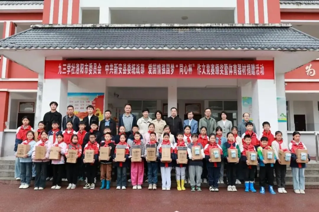 9月22日,九三学社洛阳市委会与中共新安县委统战部携手走进新安县北冶镇刘黄小学,共同举办爱国情强国梦“同心杯”作文竞赛颁奖暨体育器材捐赠活动,共捐赠了包括小学生专用书包、地球仪、图书、乒乓球桌、跳绳等总价值6000余元的物资。