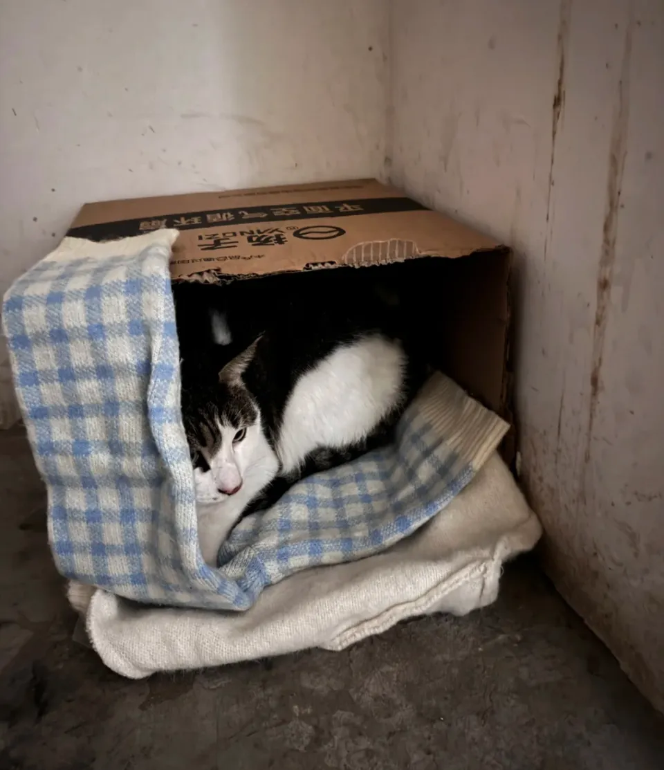 宠物信息:每天爬楼梯到28楼要吃的,最近郑州太冷了,大猫一直想往屋里钻,但是我的猫咪很怕他,之前被他打过,而且我的咪正在生病,不敢轻易然后他进门,所以就在楼道给他简单搭了一个窝,进去立马踩奶打呼噜,脾气特别好,希望有好心人可以领养。