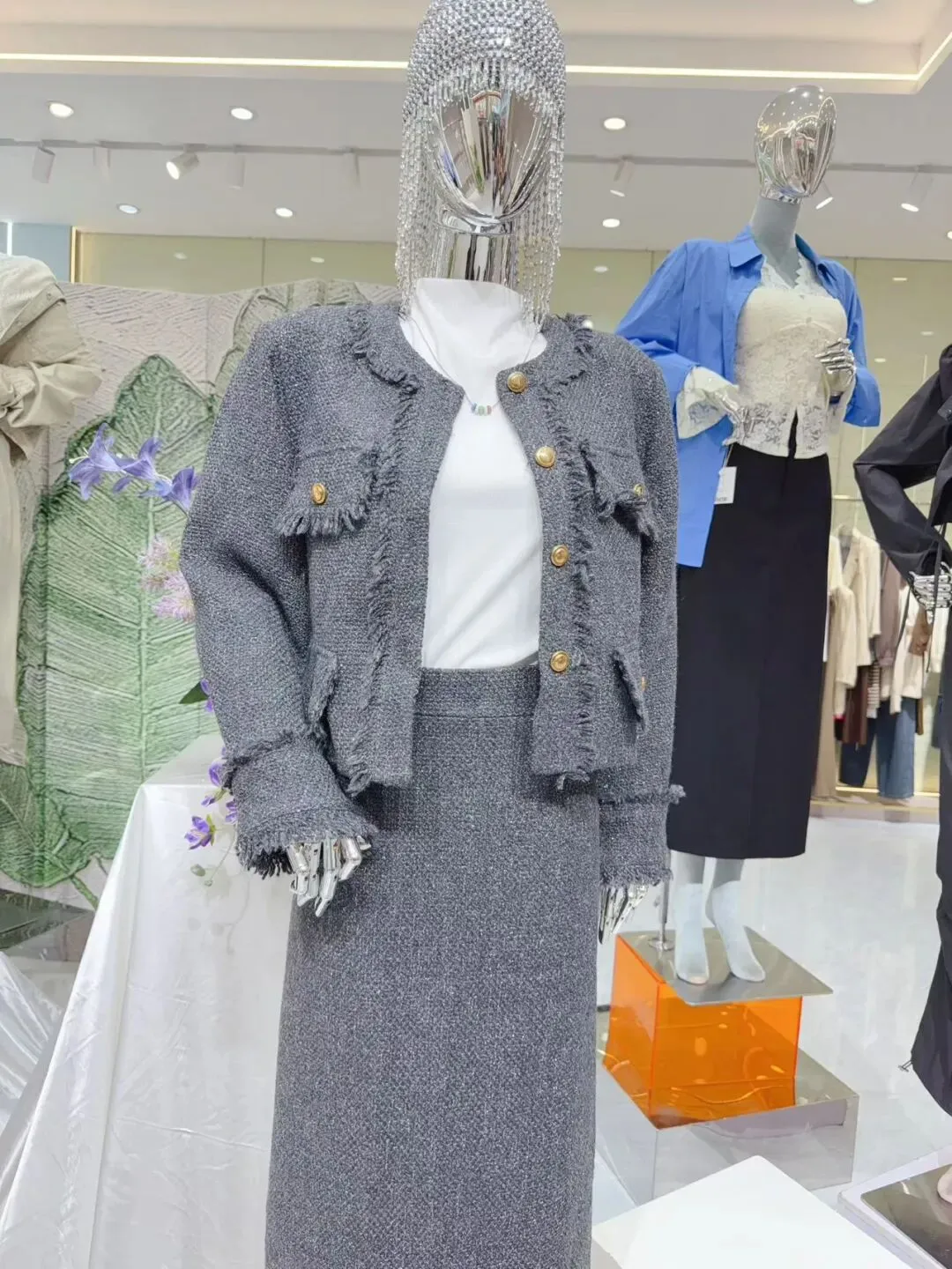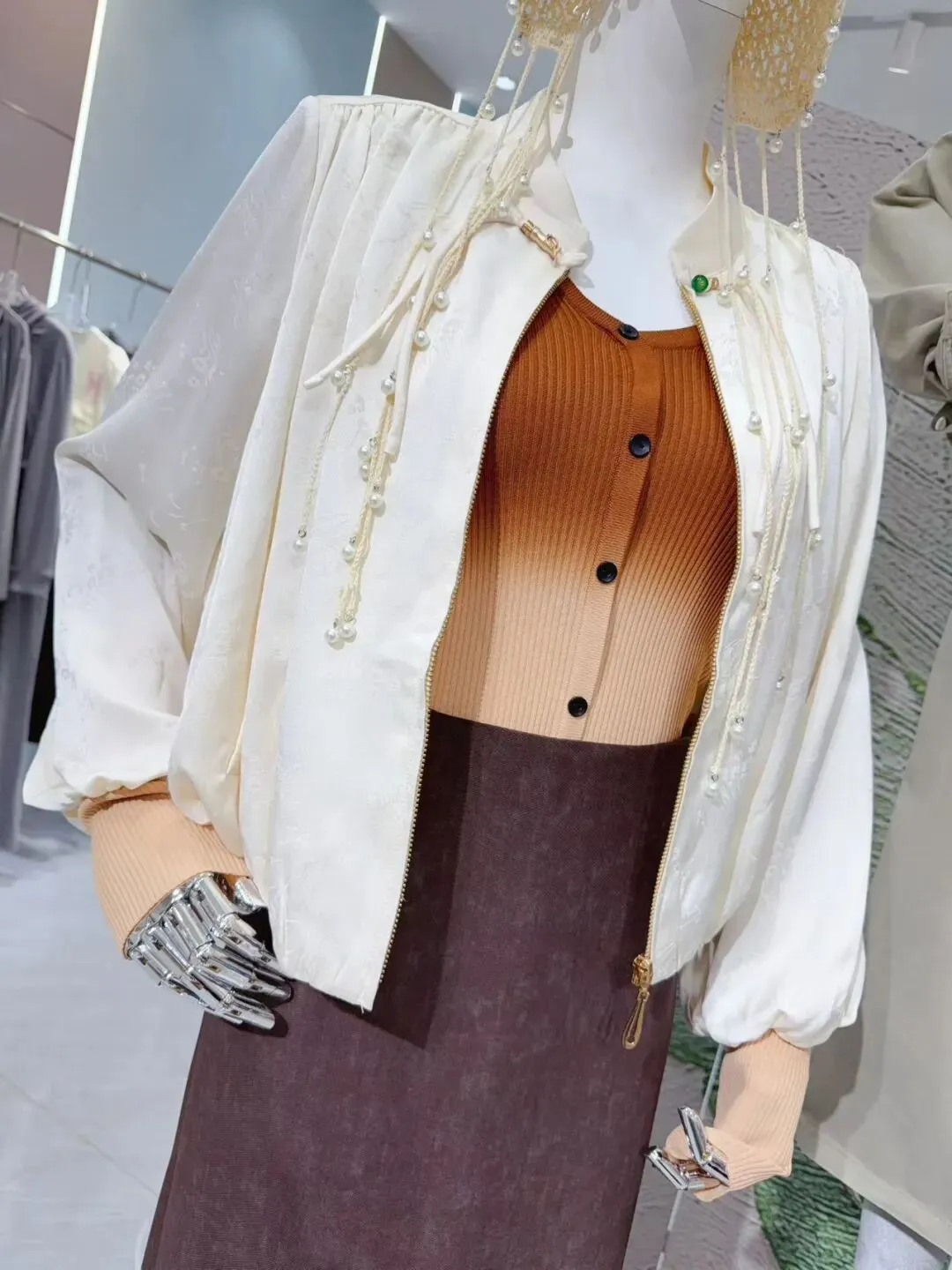 货品比例:风衣外套:7%、套装:23.5%、连衣裙:6%、上衣:35.5%,裤裙:28%