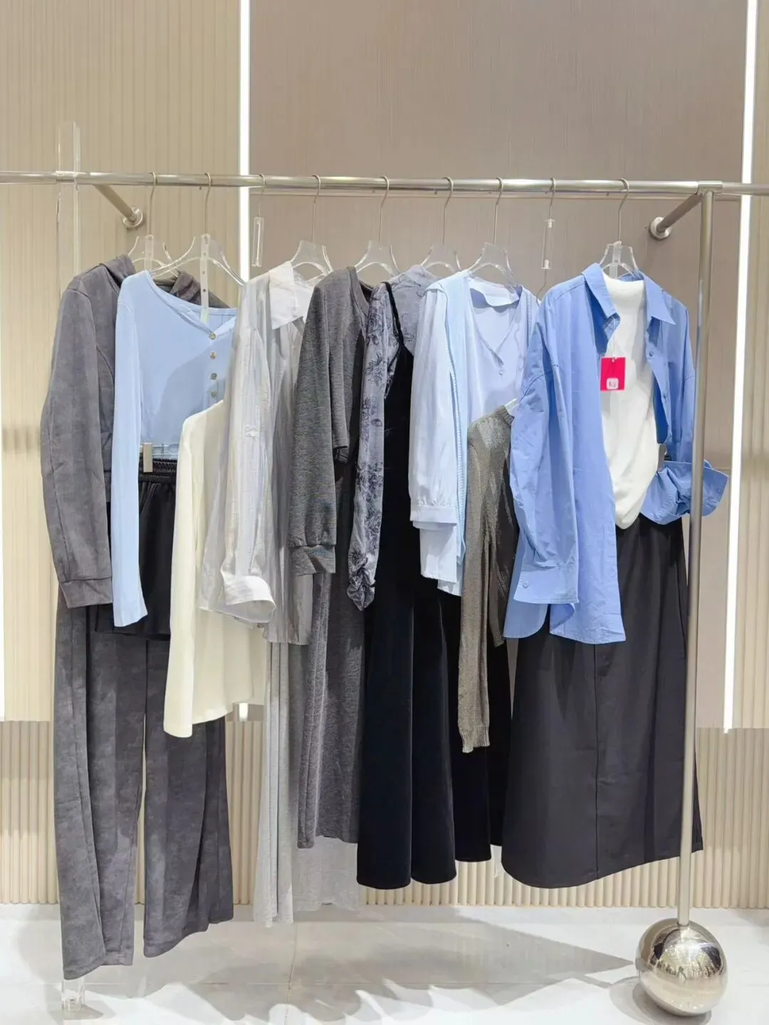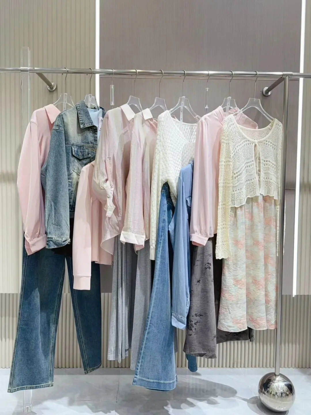 品牌份货,季度风格统一,品牌走份的方式保持了产品设计时的原始比例风格,便于搭配和连带销售。