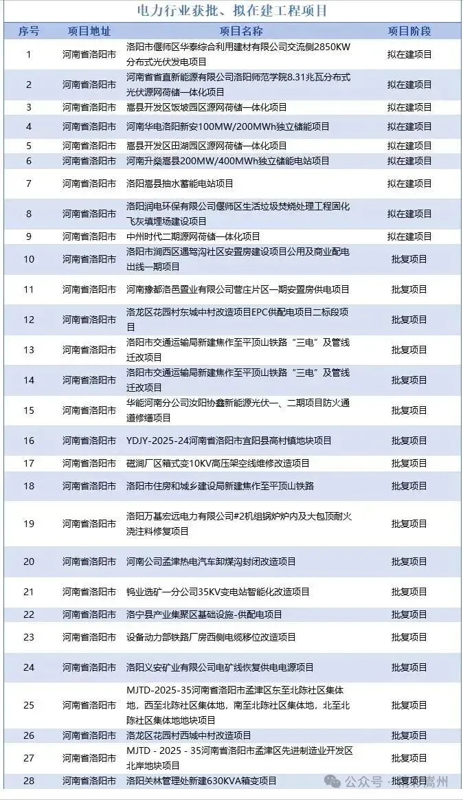 电力行业项目:聚焦电网升级改造和新能源设施建设,包括智能电网示范区、光伏发电站等项目,旨在提升供电可靠性和清洁能源占比。