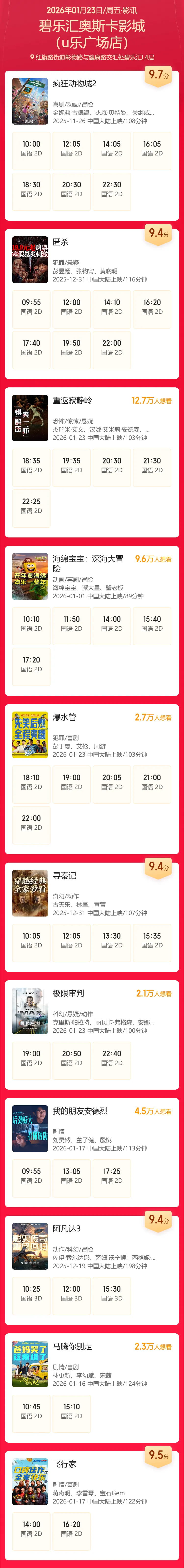 >安阳碧乐汇奥斯卡影城1月23日影讯(影讯仅供参考,具体排片以影院当日播出为准)