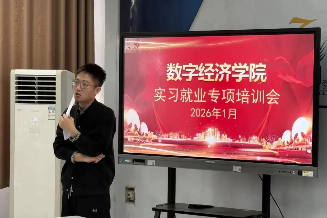 为进一步规范学院实习管理流程,提升就业服务质量,夯实全员参与实习就业工作的责任基础,2026年1月22日上午,数字经济学院在304会议室组织开展实习就业工作专题培训会。学院实习就业办公室主任戴鹏担任主讲人,全院教职工全员参会。