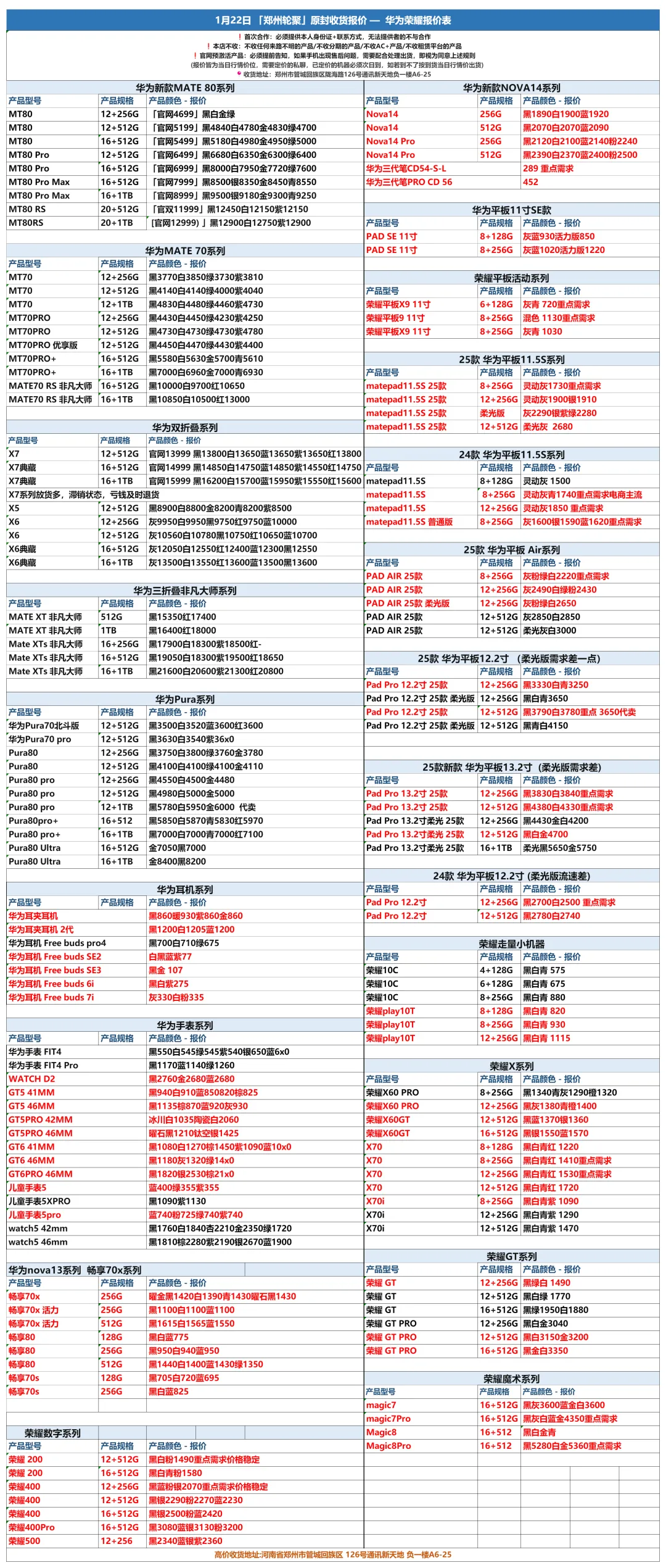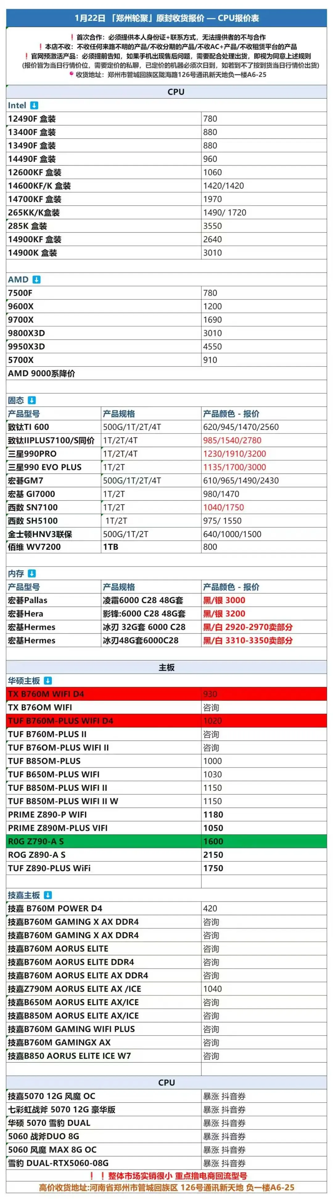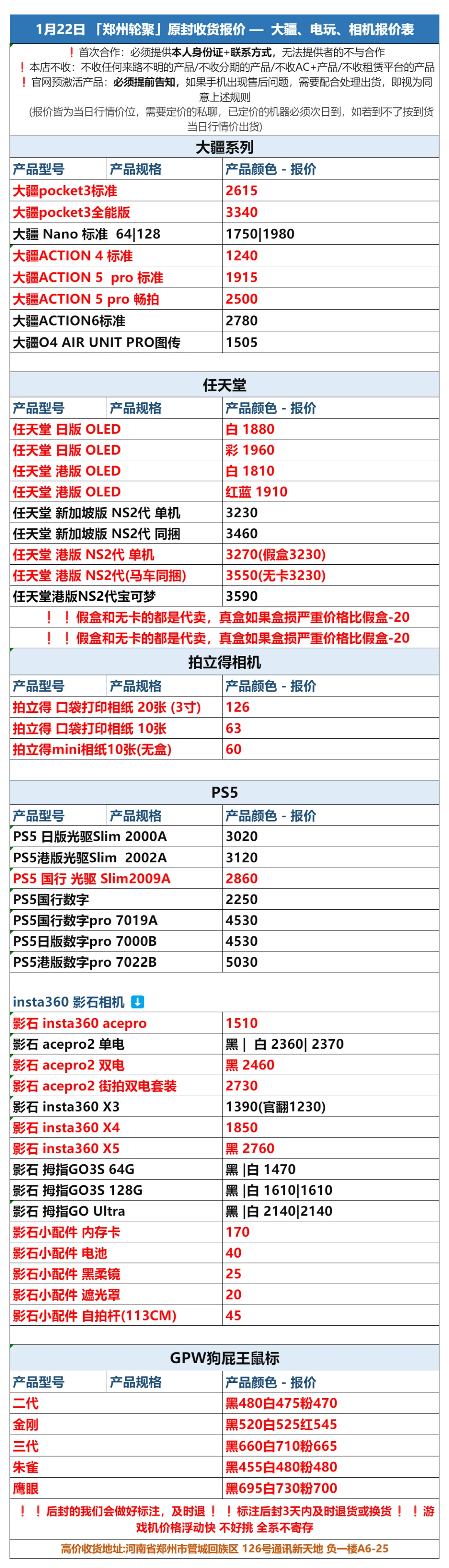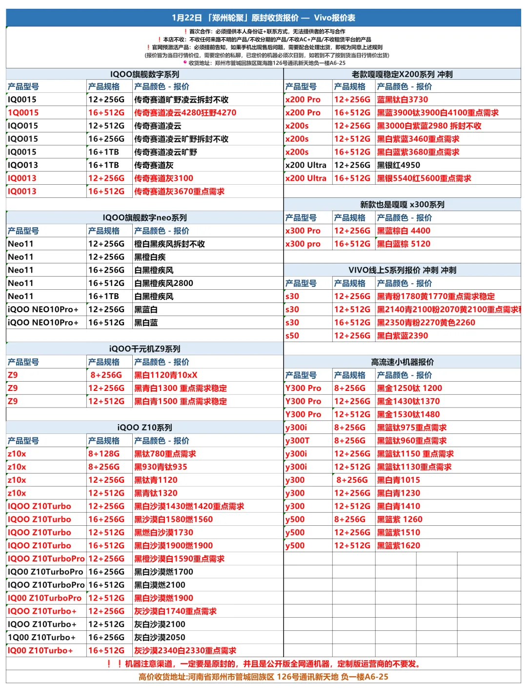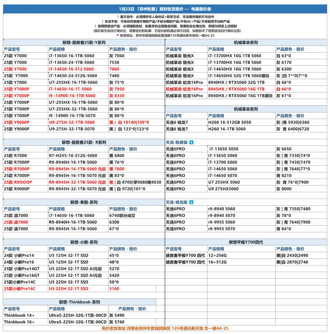 郑州轮聚通讯 2026年1.22日数码报价更新