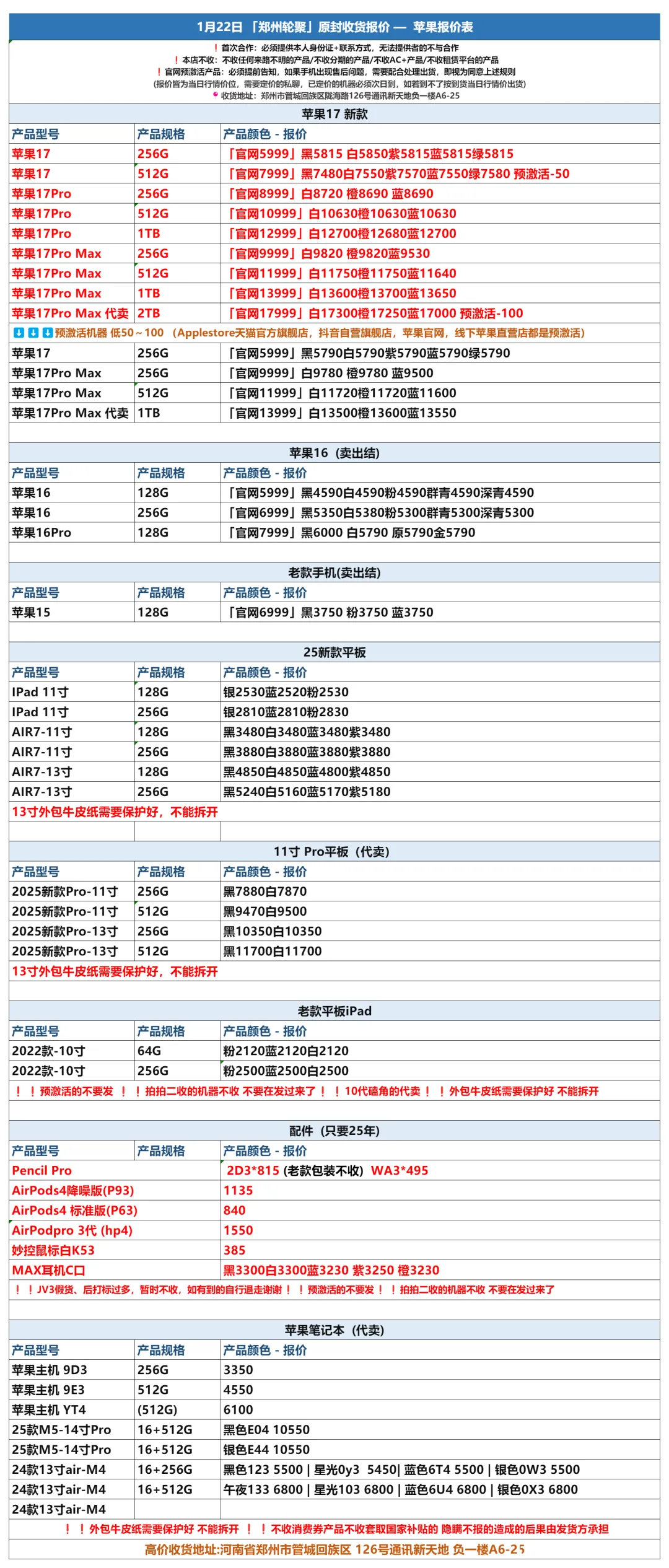 >郑州轮聚通讯 2026年1.22日数码报价更新