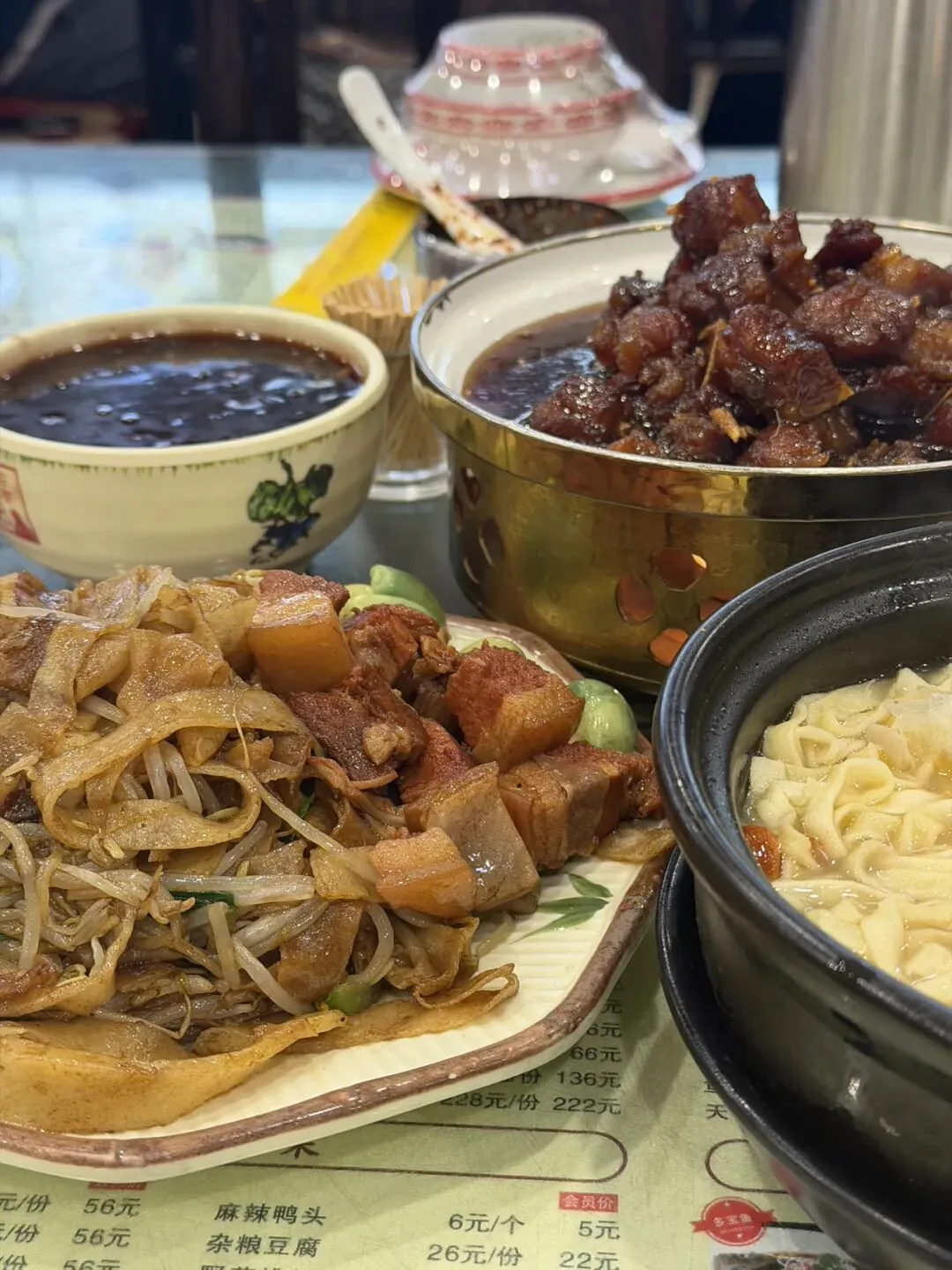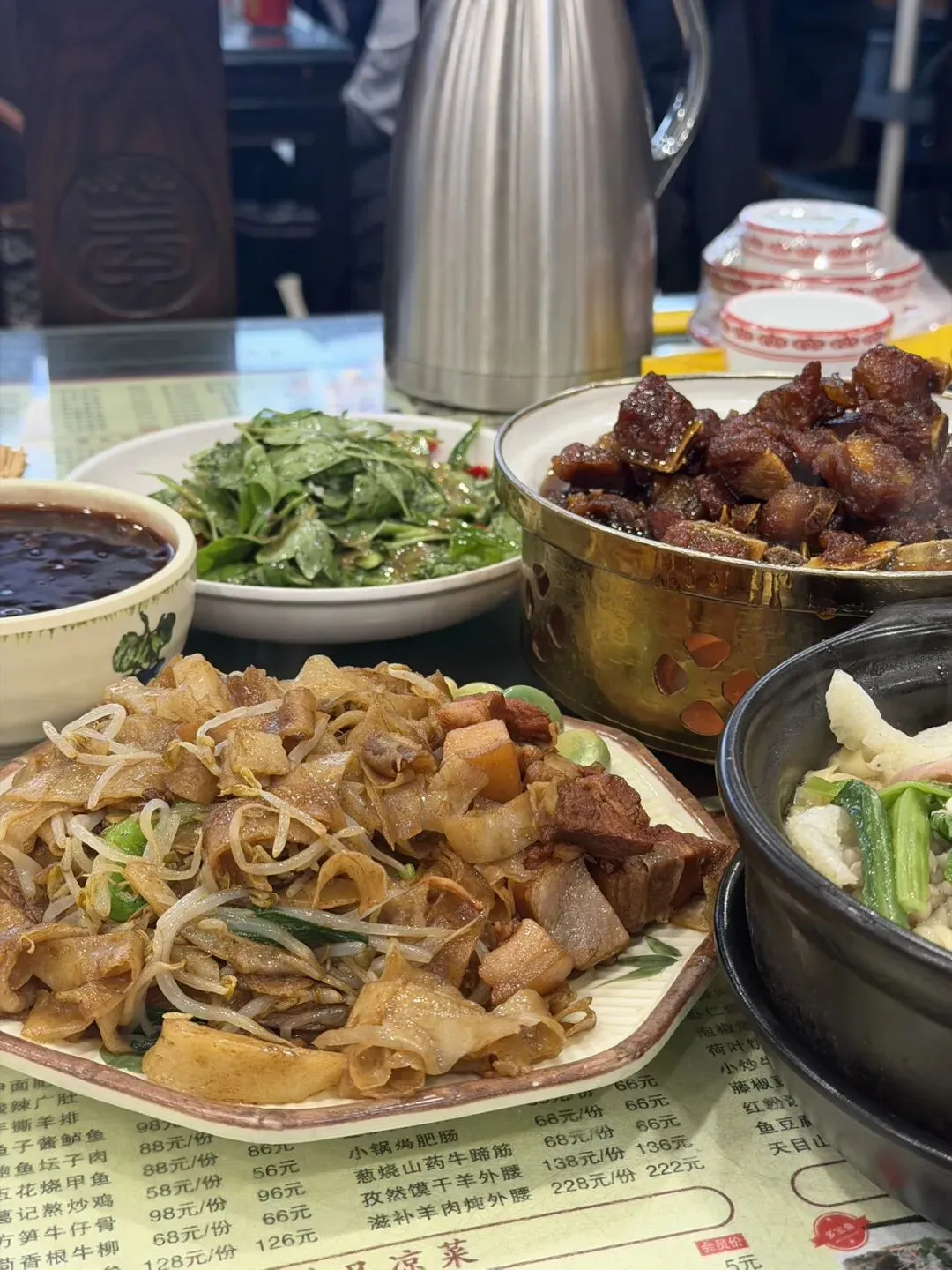 坛子肉焖饼、三鲜伊府面、叉烧排骨(有点甜)、南瓜粥、凉拌荆芥(地方特色蔬菜,河南版本的香菜爱的人很爱不爱的人爱不了