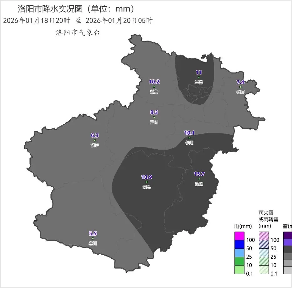 18日20时至20日05时国家观测站降水量(毫米)为:汝阳15.7、嵩县13.9、孟津11、新安10.2、伊川10.1、主城区9.4、宜阳8.3、偃师7.4、洛宁6.3、栾川5.5。