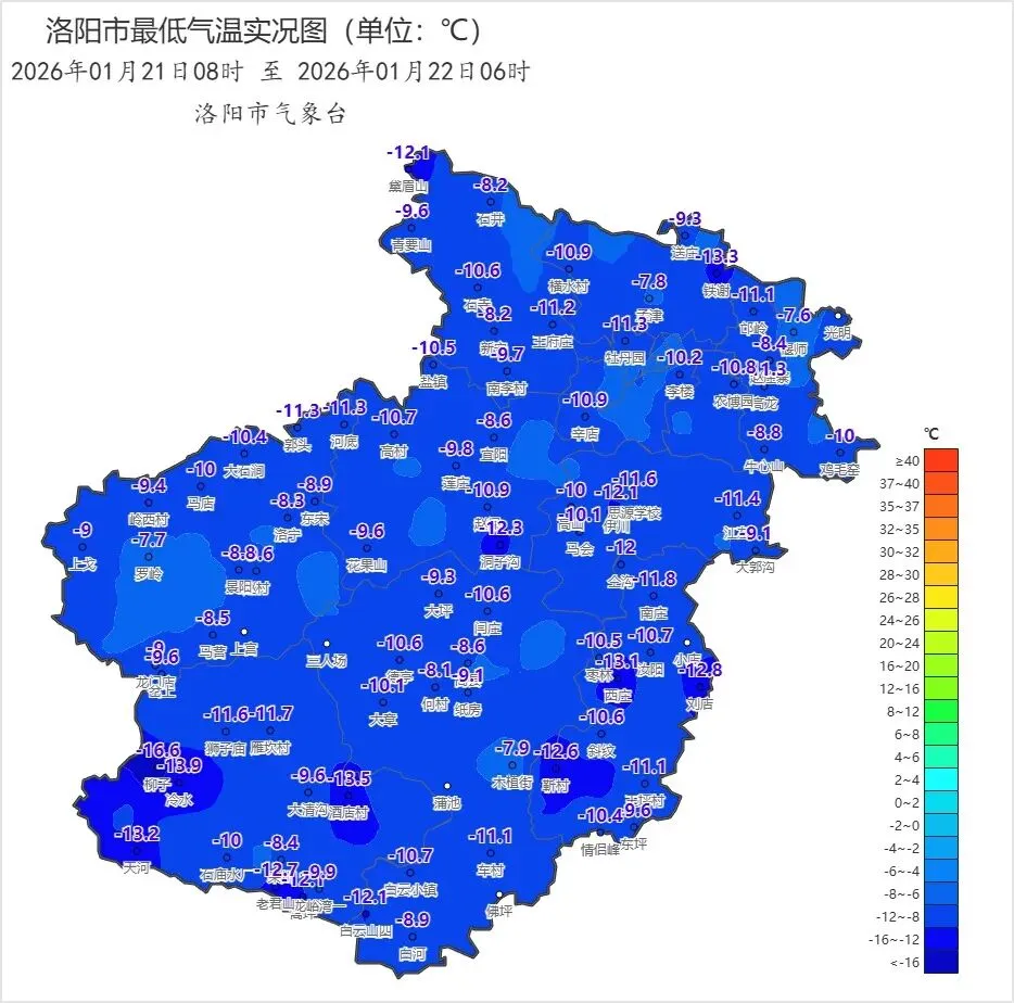本次过程全省出现明显降温,截至22日06时,全市大部最高气温降温幅度16℃到24℃,最低气温降温幅度9℃到15℃,孟津日最低气温连续降温幅度突破1月历史极值。