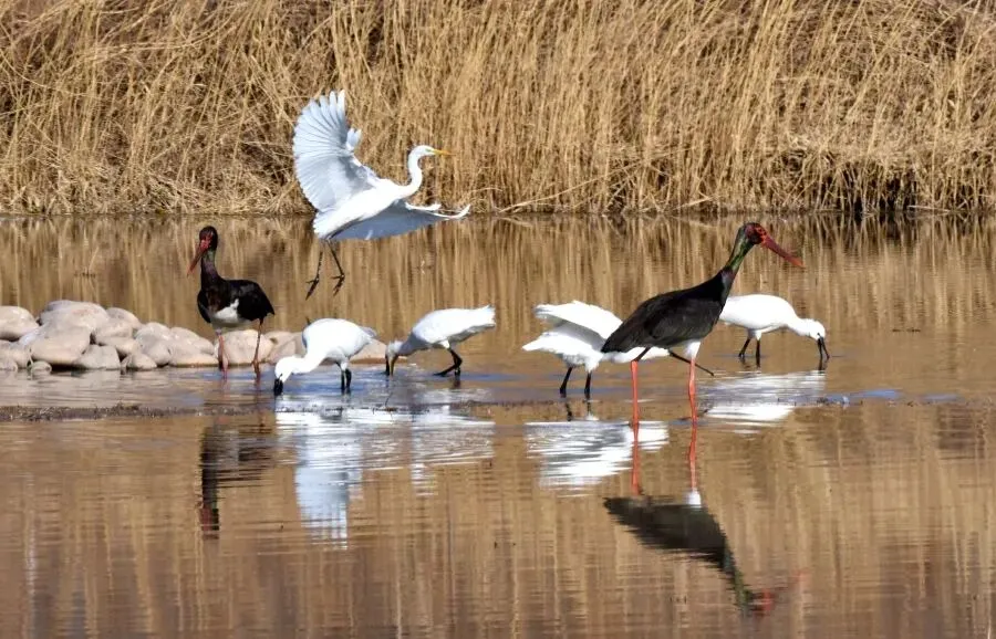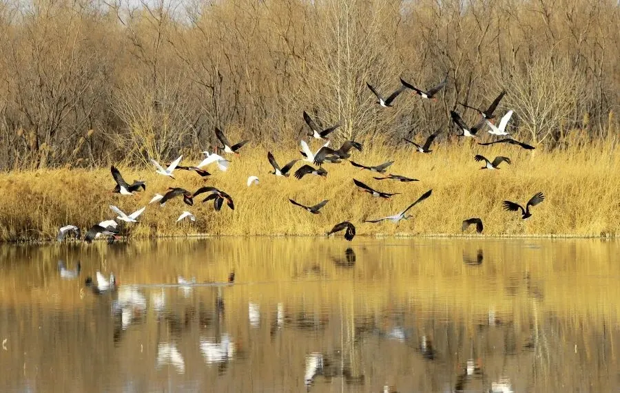 孟津黄河湿地国家级自然保护区生态环境的持续改善,直接体现在鸟类来越冬生息繁衍的种类和数量。据有关部门监测数据显示,如今该湿地的候鸟种类已从十年前的120多种增加至331种,数量常年稳定在15万只以上,除大鸨外,黑鹳、青头潜鸭等国家一级保护动物也频繁现身。尤其是国家一级保护动物黑鹳,成了这里的“常客”,不仅来的次数频繁,而且种群越来越大,停留的时间也越来越长。群鸟翔集的生动景象,不仅是孟津生态治理成效的鲜活见证,更是黄河流域人与自然和谐共生的美好缩影。