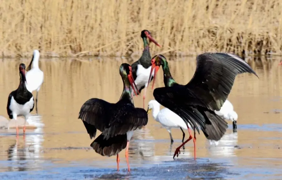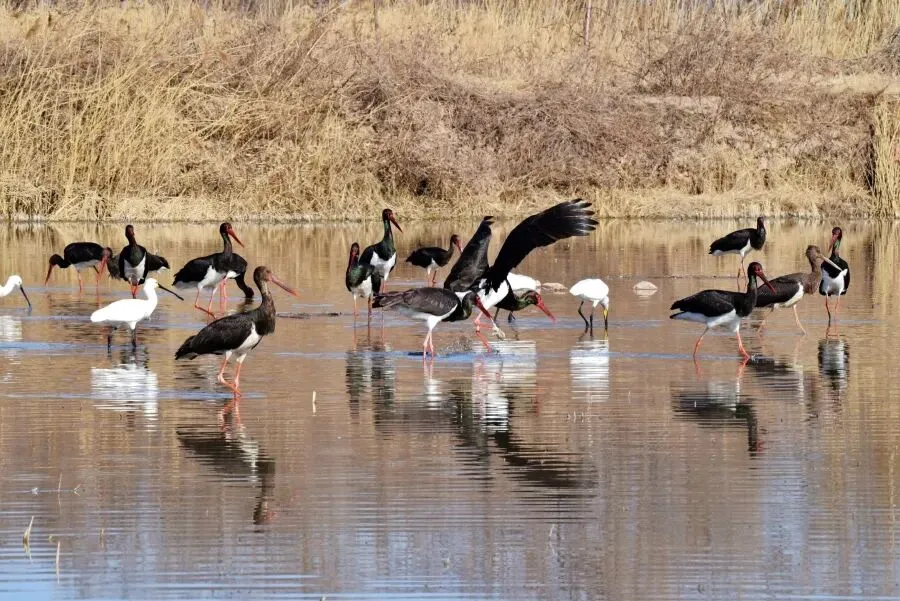 “国宝黑鹳”又来啦!1月18日,在孟津区黄河湿地国家级自然保护区,会盟镇小寨村的湿地区域又迎来46只“国宝黑鹳”大种群。澄澈的湖面倒映着蓝天,波光潋滟之中,外表华丽的黑鹳与优雅洒脱的白琵鹭、灵动自如的海鸥与白鹭同框出现,实属罕见。它们时而悠然游弋、时而水中觅食、时而振翅飞翔,仿佛一场自然天成的冬日珍稀鸟类大集会。