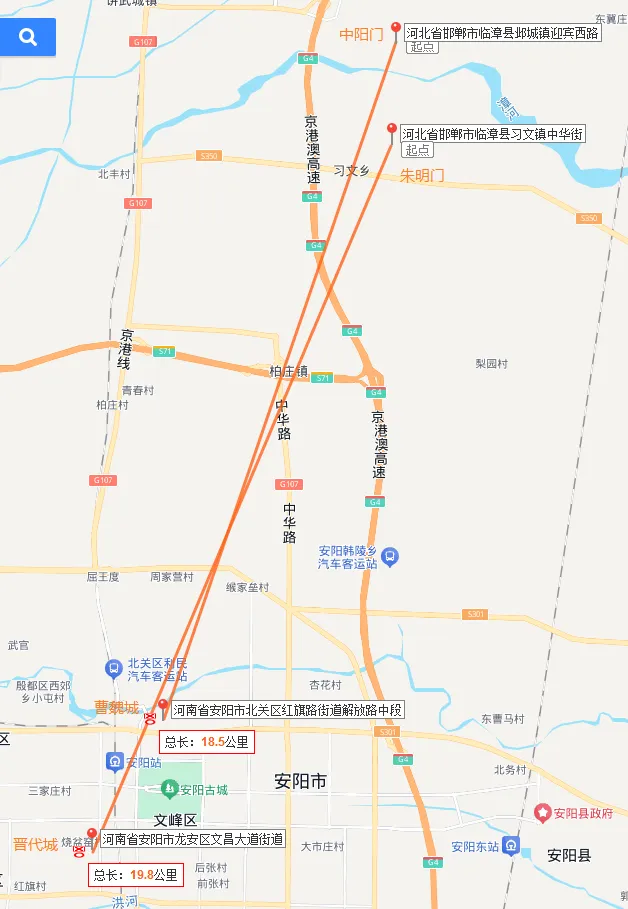 弄清楚了尺度和里制的历代沿革,我们再回到本文篇首的那个疑问,即历史记载中老邺城与安阳之间的距离,是否与今天实测的数据相符。首先,《旧唐书》记载的这次相州南迁,里程数是45里,如果从邺南城南门朱明门,到晋代安阳城之北门,即今安阳老城西南三里,宗村北面一带,实测直线距离大约是19.8公里,与北周时期的45里基本符合。其次,《水经注》所引《魏土地记》的记载,邺城南距安阳城40里,如按张之先生考证,此《魏土地记》乃是曹魏之土地记,那么40里里程,应从从邺北城南门中阳门算起,到洹河南岸的曹魏安阳城为止,今测得两地直线距离大约是18.5公里,如按曹魏一里约合416米计算,约合45里,考虑到古代的道路并非直线,两地之间的实际距离,更要远远大于记载中的40里。