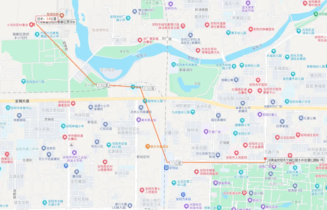 但实际上,如上图所示,按照董作宾先生给出的路线图,经过测量长度为3.9公里,即使直线距离也达到了3.4公里,均明显大于五里之说,出现这样的情况,可能说明两地之间的距离,更多的是历史传承,而非来自实际的测量。原因在于,宋代的《通鉴地理通释》,元代的《河朔访古记》,都认为河亶甲城距离安阳城五里四十步,而河亶甲城的位置,一直以来被认为正是在小屯村附近。宋代和元代的尺度、里制,有着非常明显的差别,两者都认为安阳城到小屯的距离为五里,可能更多的是因历史传承,而形成的一种习惯性说法。那么《水经注》的记载,邺城南距安阳城40里,是不是也属于类似的情况呢?答案不得而知,虽然《括地志》引《竹书纪年》称:盘庚自奄迁于北冢,曰殷墟,南去邺四十里。但张之先生认为,南去邺四十里一句,并非先秦典籍《竹书纪年》之原句,尽管如此,也许约定成俗的说法,不失为一种合理的揣测吧。