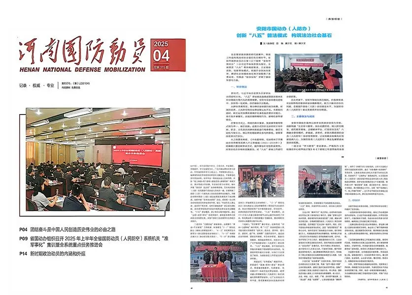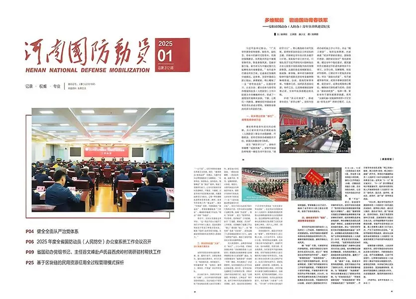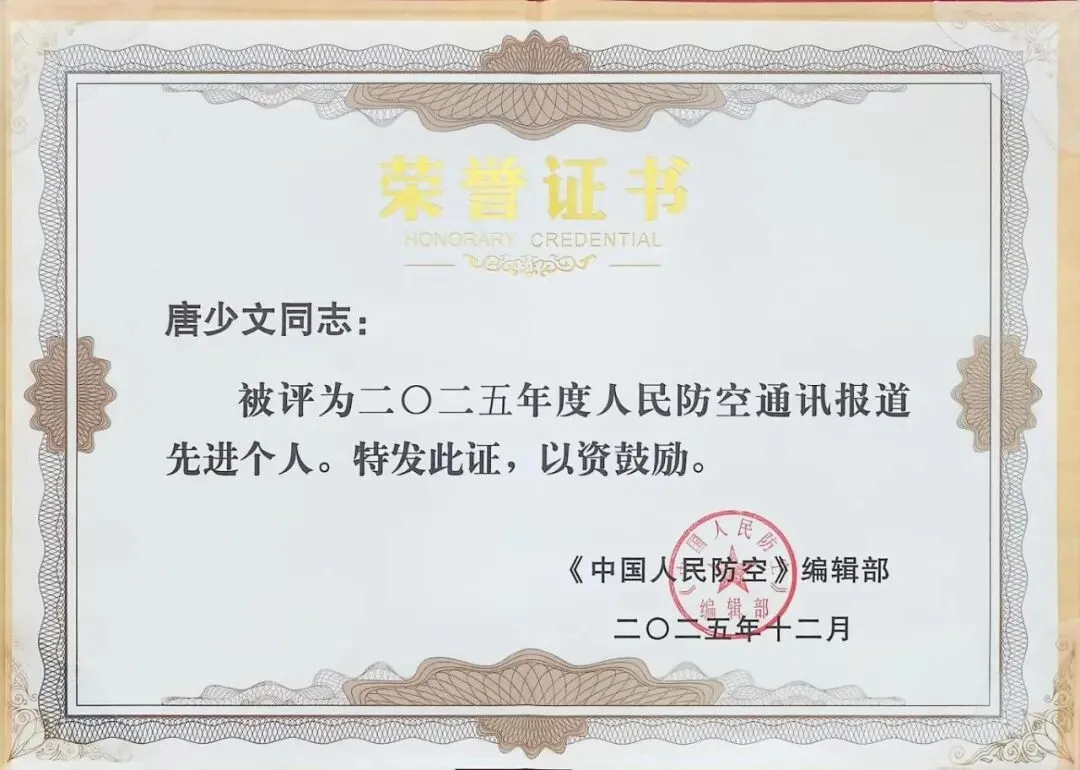 近日,安阳市国防动员办公室喜获《中国人民防空》编辑部授予的“2025年度人民防空通讯报道先进单位”称号,我办法规与宣教科科长唐少文同志获评“先进个人”。