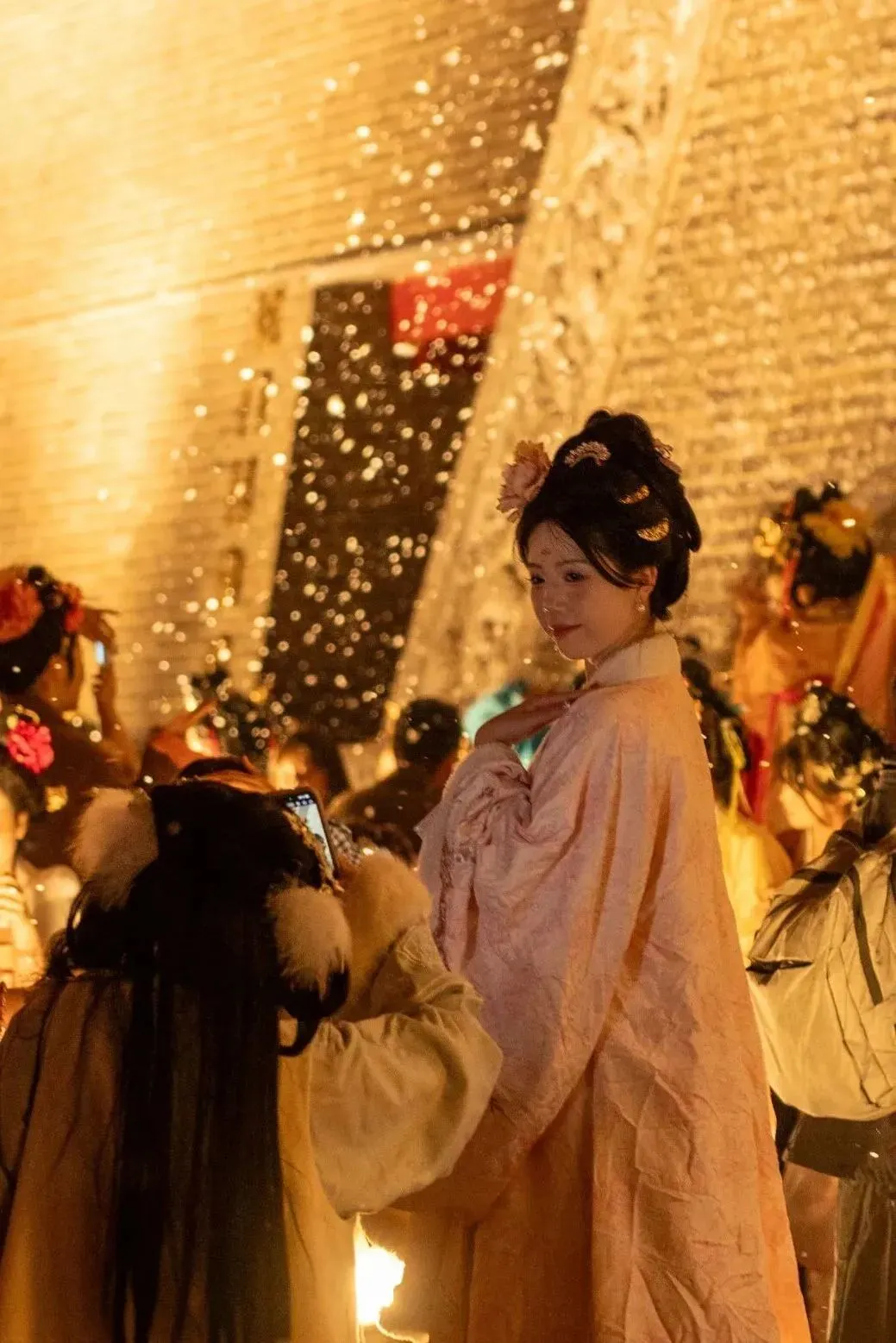 无数洁白的“雪花”从城楼上方纷扬洒落,在金色灯光的映照下,每一片都闪烁着梦幻的光晕。它们温柔地落在肩头,落在朱红的宫墙与斗拱上,将历史的厚重瞬间点染成神都的浪漫。